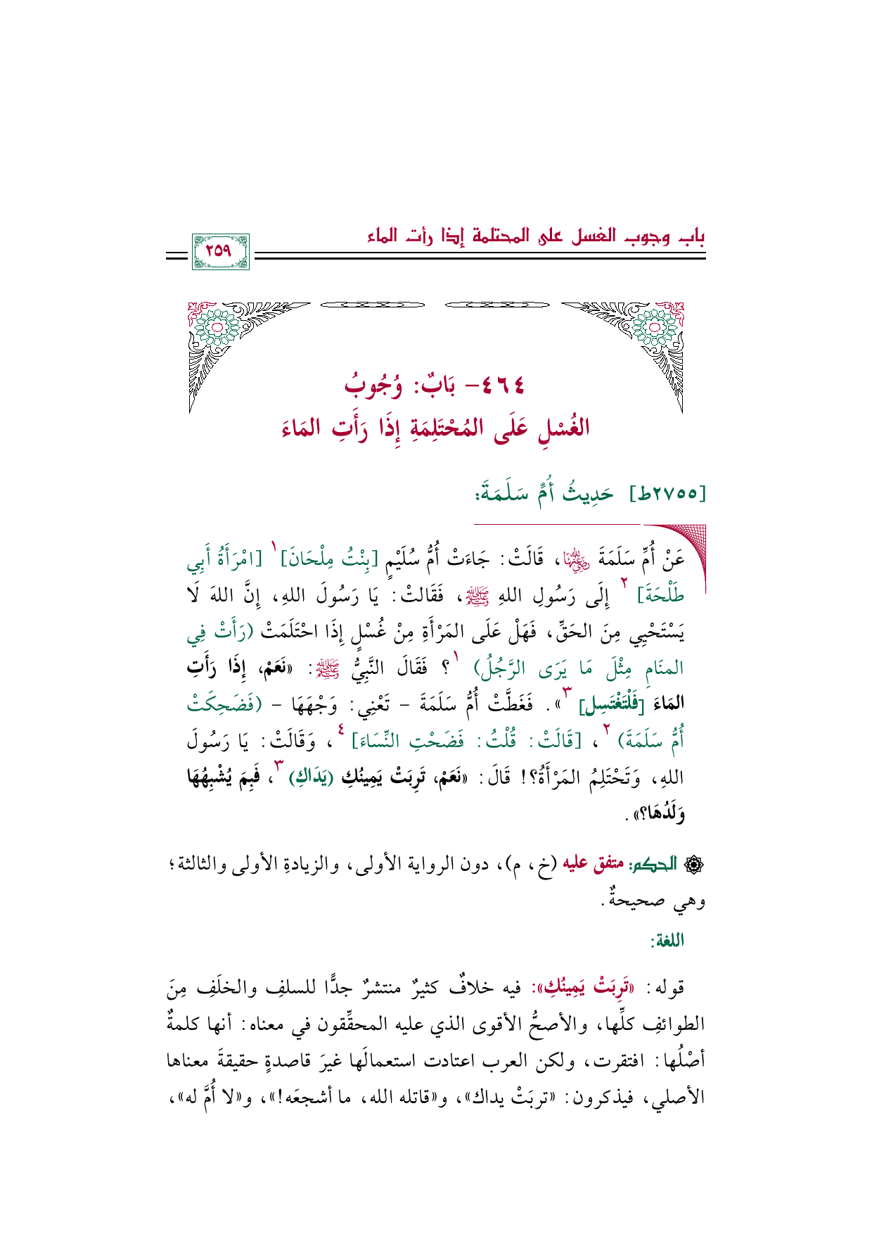 قوله ((تَرِبَتْ يَمِينُكِ)): فيه خلافٌ كثيرٌ منتشرٌ جدًّا للسلفِ والخلَفِ مِنَ الطوائفِ كلِّها، والأصحُّ الأقوى الذي عليه المحقِّقون في معناه: أنها كلمةٌ أصْلُها: افتقرت، ولكن العرب اعتادت استعمالَها غيرَ قاصدةٍ حقيقةَ معناها الأصلي، فيذكرون: ((تربَتْ يداك))، و ((قاتله الله، ما أشجعَه! ))، و ((لا أُمَّ له))،