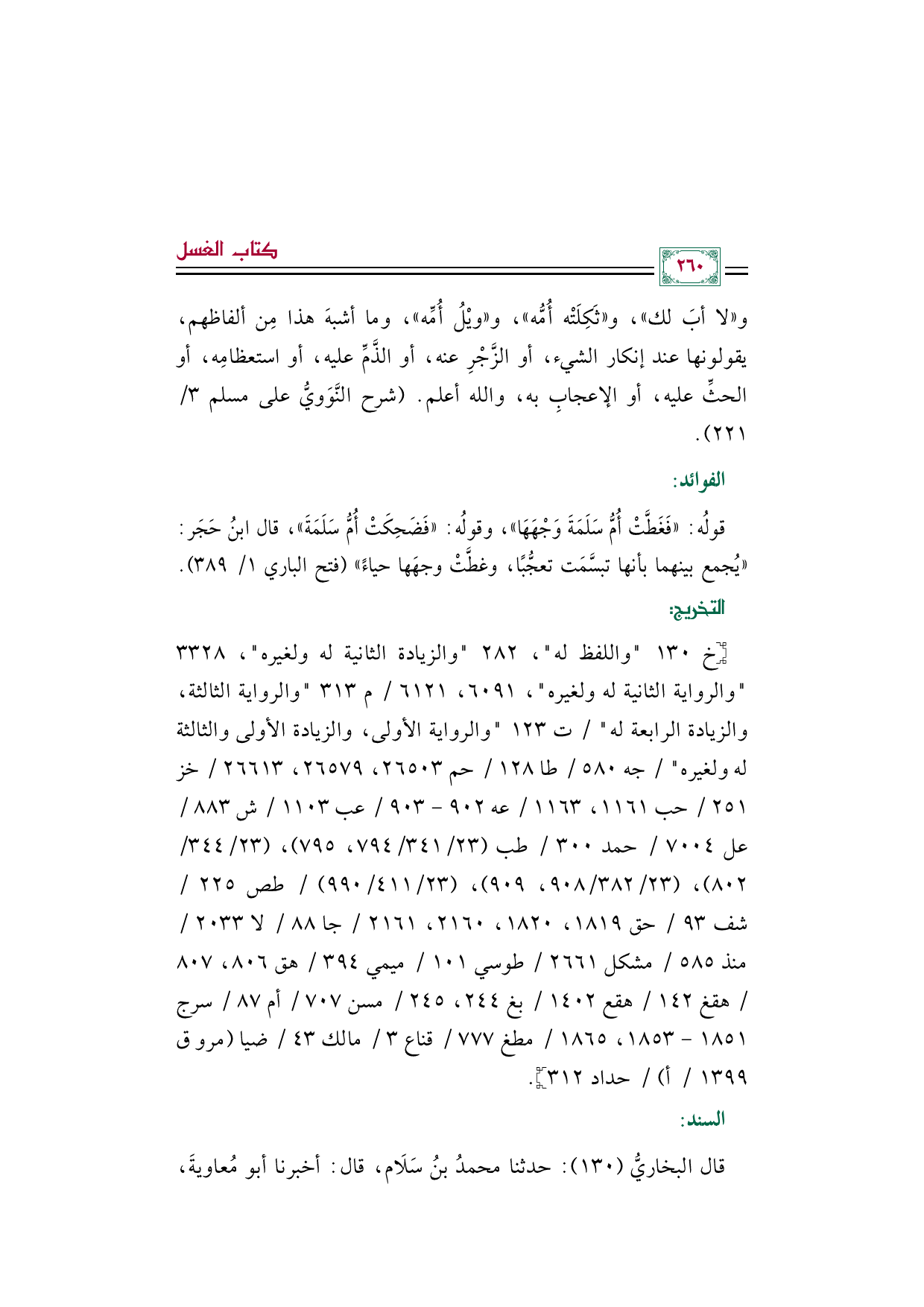 قولُه: ((فَغَطَّتْ أُمُّ سَلَمَةَ وَجْهَهَا))، وقولُه: ((فَضَحِكَتْ أُمُّ سَلَمَةَ))، قال ابنُ حَجَر: "يُجمع بينهما بأنها تبسَّمَت تعجُّبًا، وغطَّتْ وجهَها حياءً" (فتح الباري ١/ ٣٨٩).