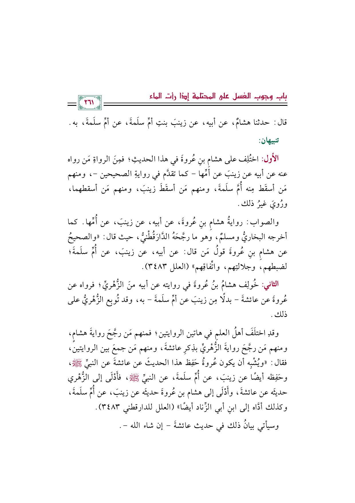 الأول: اختُلِف على هشامِ بنِ عُروةَ في هذا الحديثِ؛ فمِنَ الرواةِ مَن رواه عنه عن أبيه عن زينبَ عن أمِّها -كما تقدَّم في روايةِ الصحيحين-، ومنهم مَن أسقَط مِنه أُمَّ سلَمةَ، ومنهم مَن أسقَطَ زينبَ، ومنهم مَن أسقطهما، ورُويَ غيرُ ذلك.