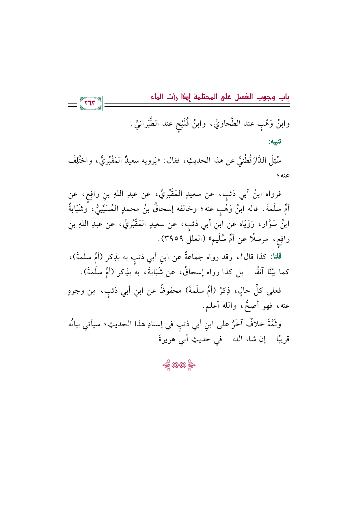 فرواه ابنُ أبي ذئبٍ، عن سعيدٍ المَقْبُريِّ، عن عبدِ اللهِ بنِ رافِعٍ، عن أمِّ سلَمةَ. قاله ابنُ وَهْبٍ عنه؛ وخالفه إسحاقُ بنُ محمدٍ المُسَيِّبيُّ، وشَبَابةُ بنُ سَوَّار، رَوَيَاه عن ابنِ أبي ذئبٍ، عن سعيدٍ المَقْبُريِّ، عن عبدِ اللهِ بنِ رافِعٍ، مرسلًا عن أمِّ سُلَيم" (العلل ٣٩٥٩).