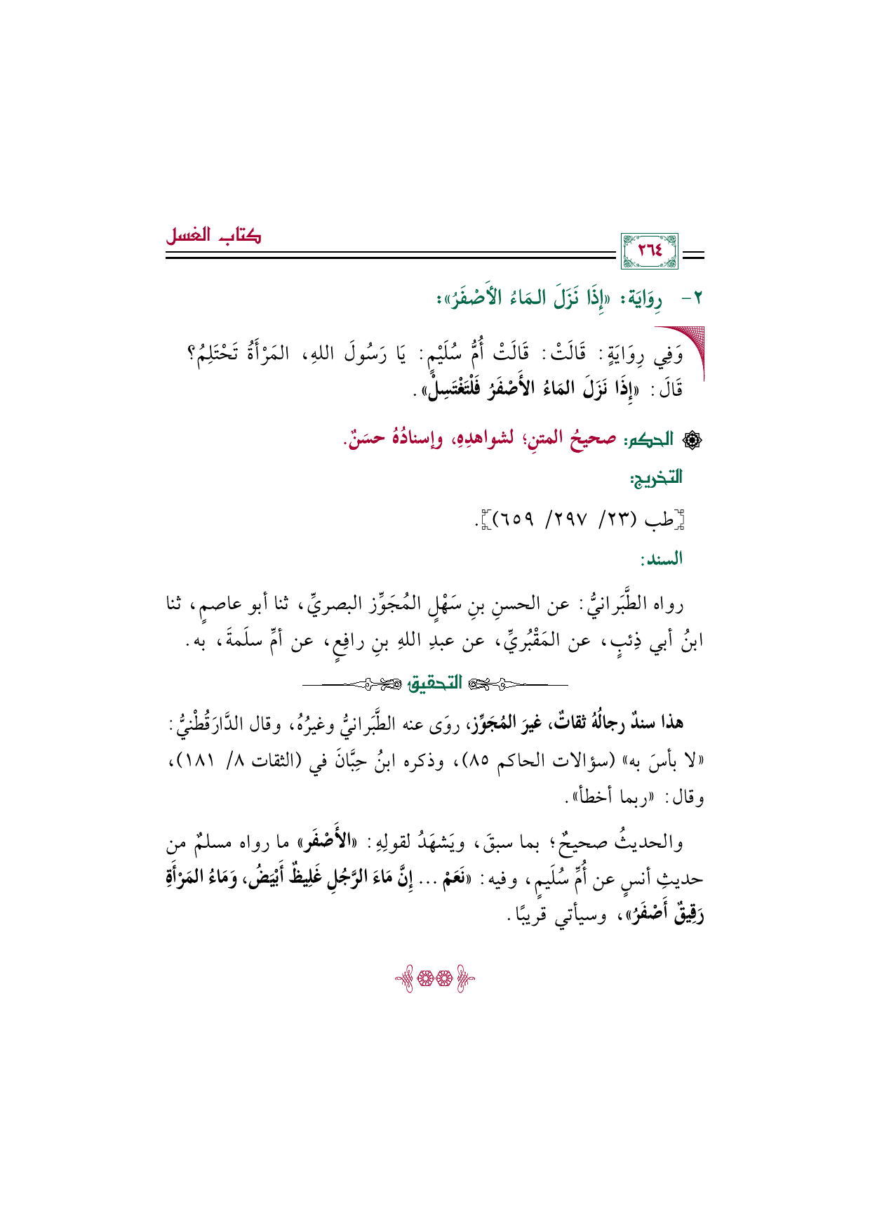 والحديثُ صحيحٌ؛ بما سبقَ، ويَشهَدُ لقولِهِ: ((الأَصْفَر)) ما رواه مسلمٌ من حديثِ أنسٍ عن أُمِّ سُلَيمٍ، وفيه: ((نَعَمْ ... إِنَّ مَاءَ الرَّجُلِ غَلِيظٌ أَبْيَضُ، وَمَاءُ المَرْأَةِ رَقِيقٌ أَصْفَرُ))، وسيأتي قريبًا.