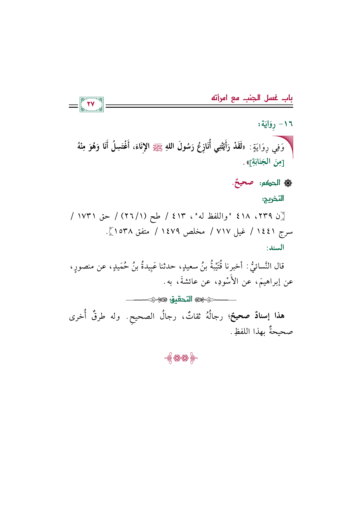 قال النَّسائيُّ: أخبرنا قُتَيْبةُ بنُ سعيدٍ، حدثنا عَبِيدةُ بنُ حُمَيدٍ، عن منصورٍ، عن إبراهيمَ، عن الأَسْودِ، عن عائشةَ، به.