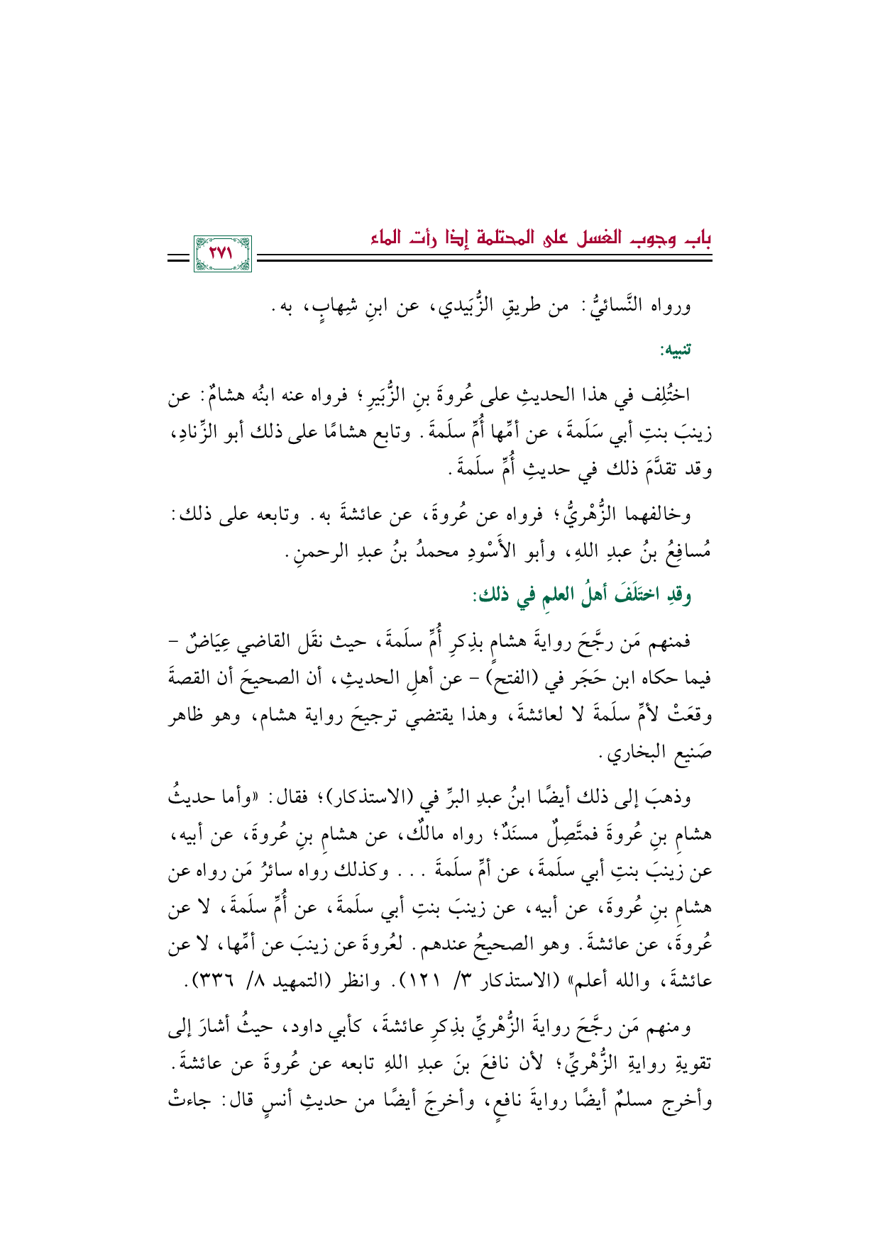 وذهبَ إلى ذلك أيضًا ابنُ عبدِ البرِّ في (الاستذكار)؛ فقال: "وأما حديثُ هشامِ بنِ عُروةَ فمتَّصِلٌ مسنَدٌ؛ رواه مالكٌ، عن هشامِ بنِ عُروةَ، عن أبيه، عن زينبَ بنتِ أبي سلَمةَ، عن أمِّ سلَمةَ ... وكذلك رواه سائرُ مَن رواه عن هشامِ بنِ عُروةَ، عن أبيه، عن زينبَ بنتِ أبي سلَمةَ، عن أُمِّ سلَمةَ، لا عن عُروةَ، عن عائشةَ. وهو الصحيحُ عندهم. لعُروةَ عن زينبَ عن أمِّها، لا عن عائشةَ، والله أعلم" (الاستذكار ٣/ ١٢١). وانظر (التمهيد ٨/ ٣٣٦).