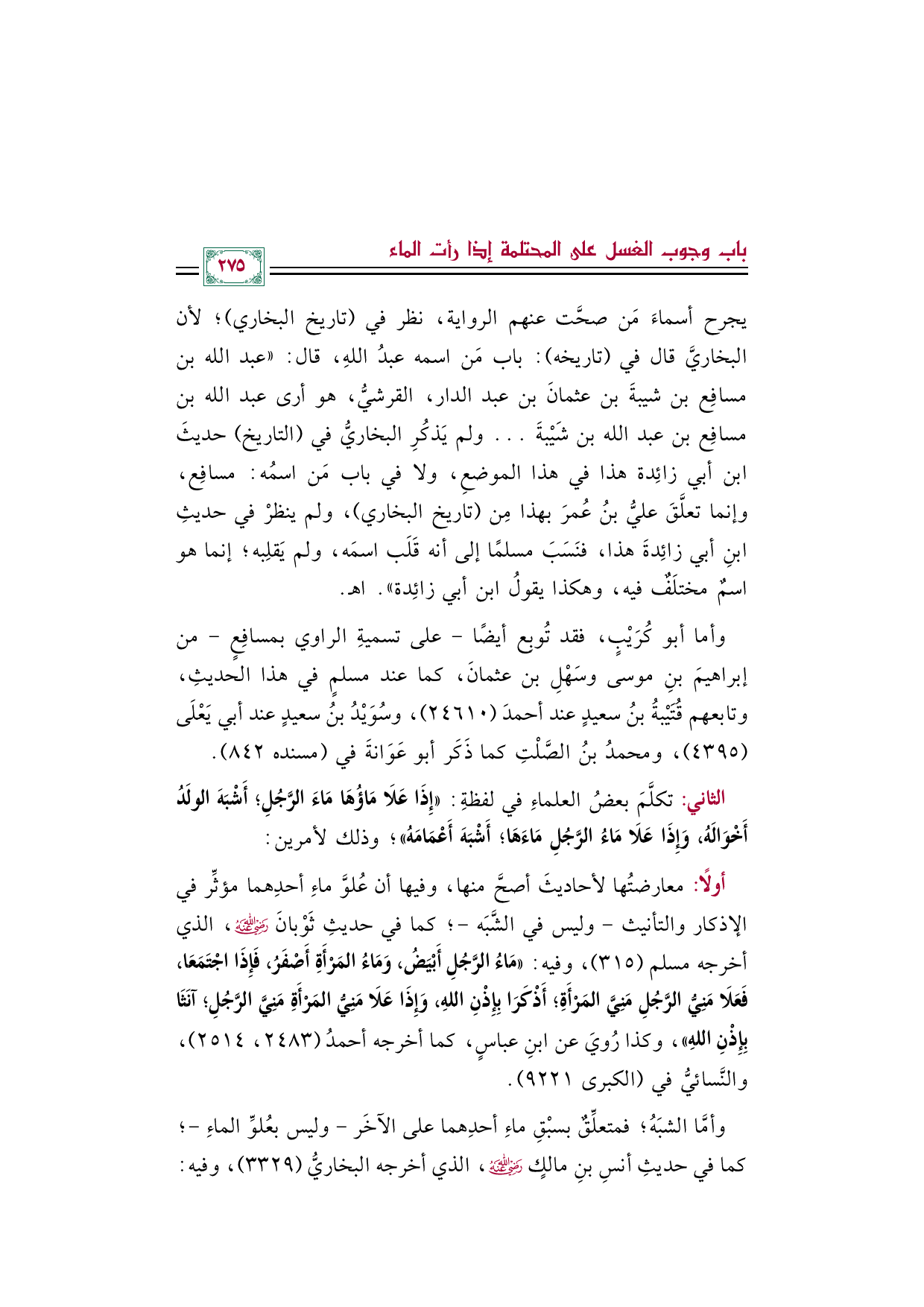 الثاني: تكلَّمَ بعضُ العلماءِ في لفظةِ: ((إِذَا عَلَا مَاؤُهَا مَاءَ الرَّجُلِ؛ أَشْبَهَ الولَدُ أَخْوَالَهُ، وَإِذَا عَلَا مَاءُ الرَّجُلِ مَاءَهَا؛ أَشْبَهَ أَعْمَامَهُ))؛ وذلك لأمرين: