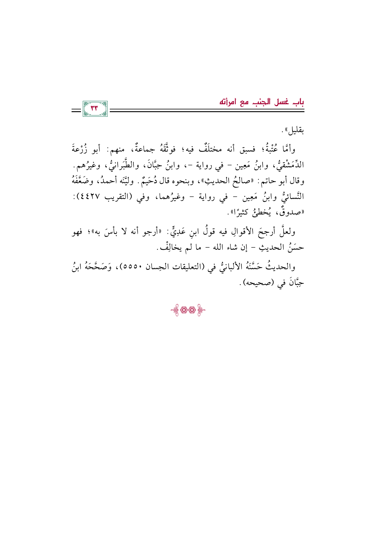 وأمَّا عُتْبةُ؛ فسبق أنه مختلَفٌ فيه؛ فوثَّقَهُ جماعةٌ، منهم: أبو زُرْعةَ الدِّمَشْقيُّ، وابنُ مَعِين -في رواية-، وابنُ حِبَّانَ، والطَّبَرانيُّ، وغيرُهم. وقال أبو حاتم: "صالحُ الحديثِ"، وبنحوه قال دُحَيمٌ. وليَّنَه أحمدُ، وضَعَّفَهُ النَّسائيُّ وابنُ مَعِين -في رواية- وغيرُهما، وفي (التقريب ٤٤٢٧): "صدوقٌ، يُخطئُ كثيرًا".