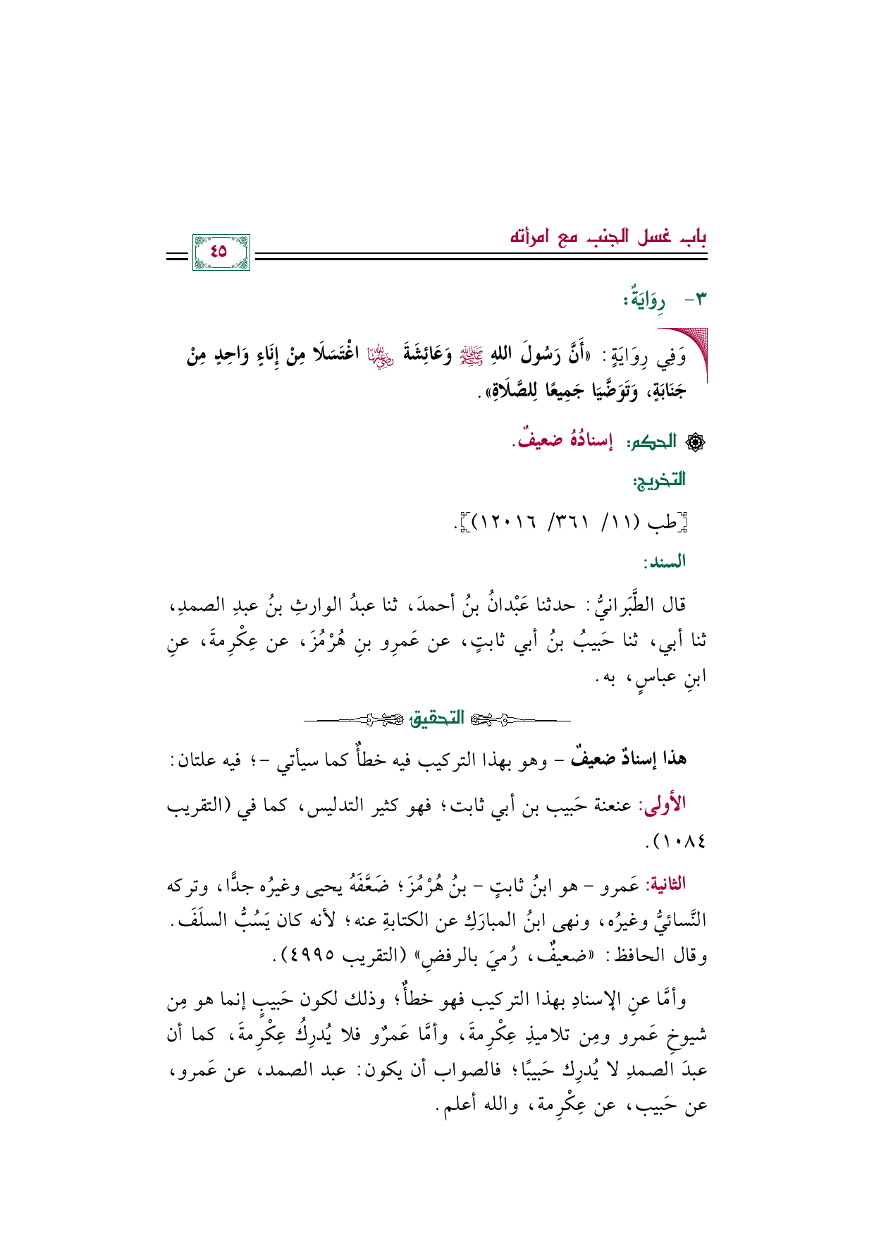 وأمَّا عنِ الإسنادِ بهذا التركيب فهو خطأٌ؛ وذلك لكون حَبيبٍ إنما هو مِن شيوخِ عَمرو ومِن تلاميذِ عِكْرِمةَ، وأمَّا عَمرٌو فلا يُدرِكُ عِكْرِمةَ، كما أن عبدَ الصمدِ لا يُدرِك حَبيبًا؛ فالصواب أن يكون: عبد الصمد، عن عَمرو، عن حَبيب، عن عِكْرِمة، والله أعلم.
