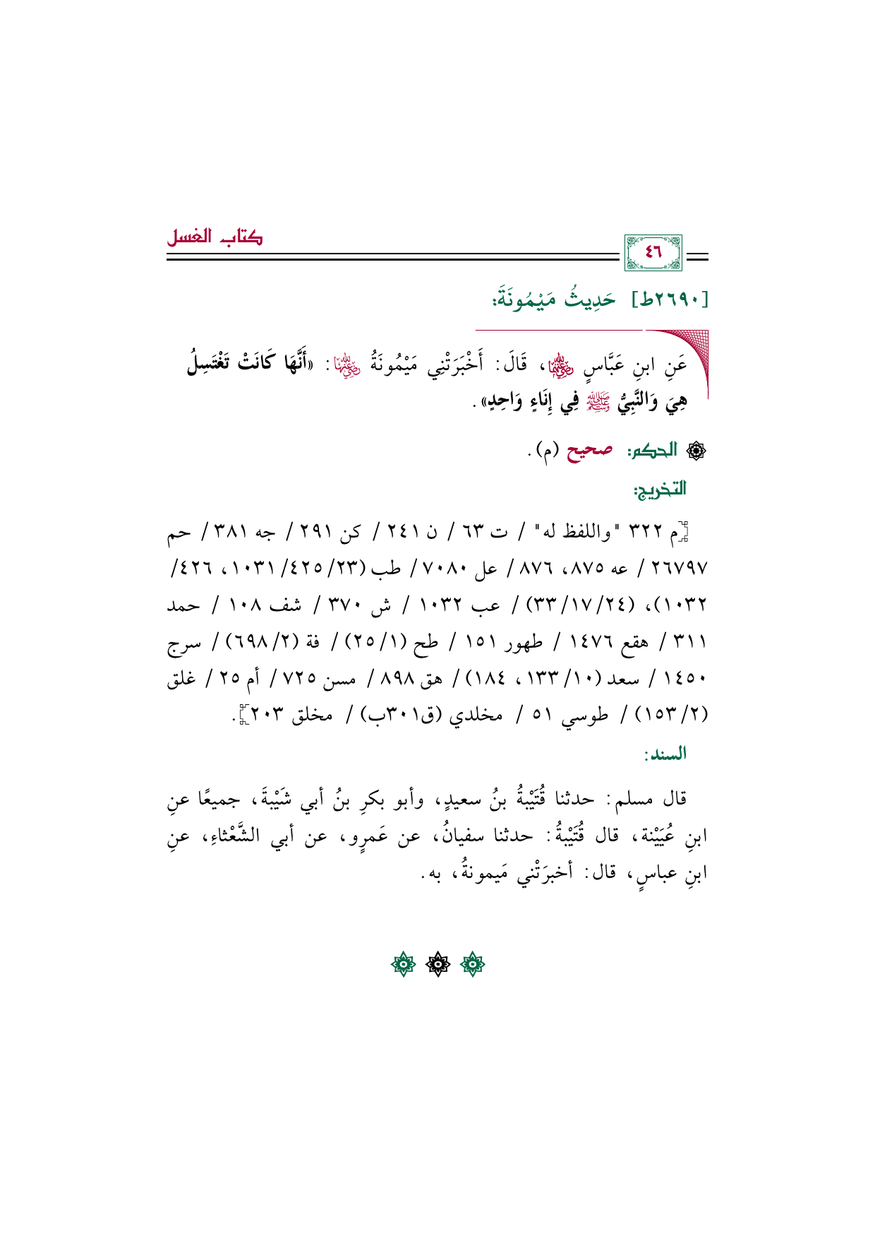 ◼ عَنِ ابنِ عَبَّاسٍ رضي الله عنهما، قَالَ: أَخْبَرَتْنِي مَيْمُونَةُ رضي الله عنها: ((أَنَّهَا كَانَتْ تَغْتَسِلُ هِيَ وَالنَّبِيُّ صلى الله عليه وسلم فِي إِنَاءٍ وَاحِدٍ)).