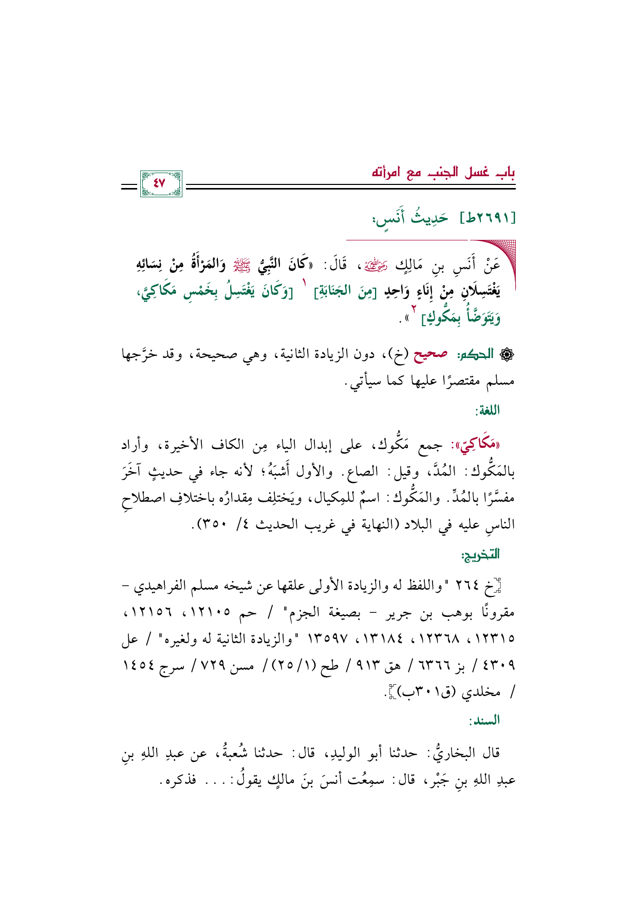 ◼ عَنْ أَنَسِ بنِ مَالِكٍ رضي الله عنه، قَالَ: ((كَانَ النَّبِيُّ صلى الله عليه وسلم وَالمَرْأَةُ مِنْ نِسَائِهِ يَغْتَسِلَانِ مِنْ إِنَاءٍ وَاحِدٍ [مِنَ الجَنَابَةِ] ١ [وَكَانَ يَغْتَسِلُ بِخَمْسِ مَكَاكِيَّ، وَيَتَوَضَّأُ بِمَكُّوكٍ] ٢)).