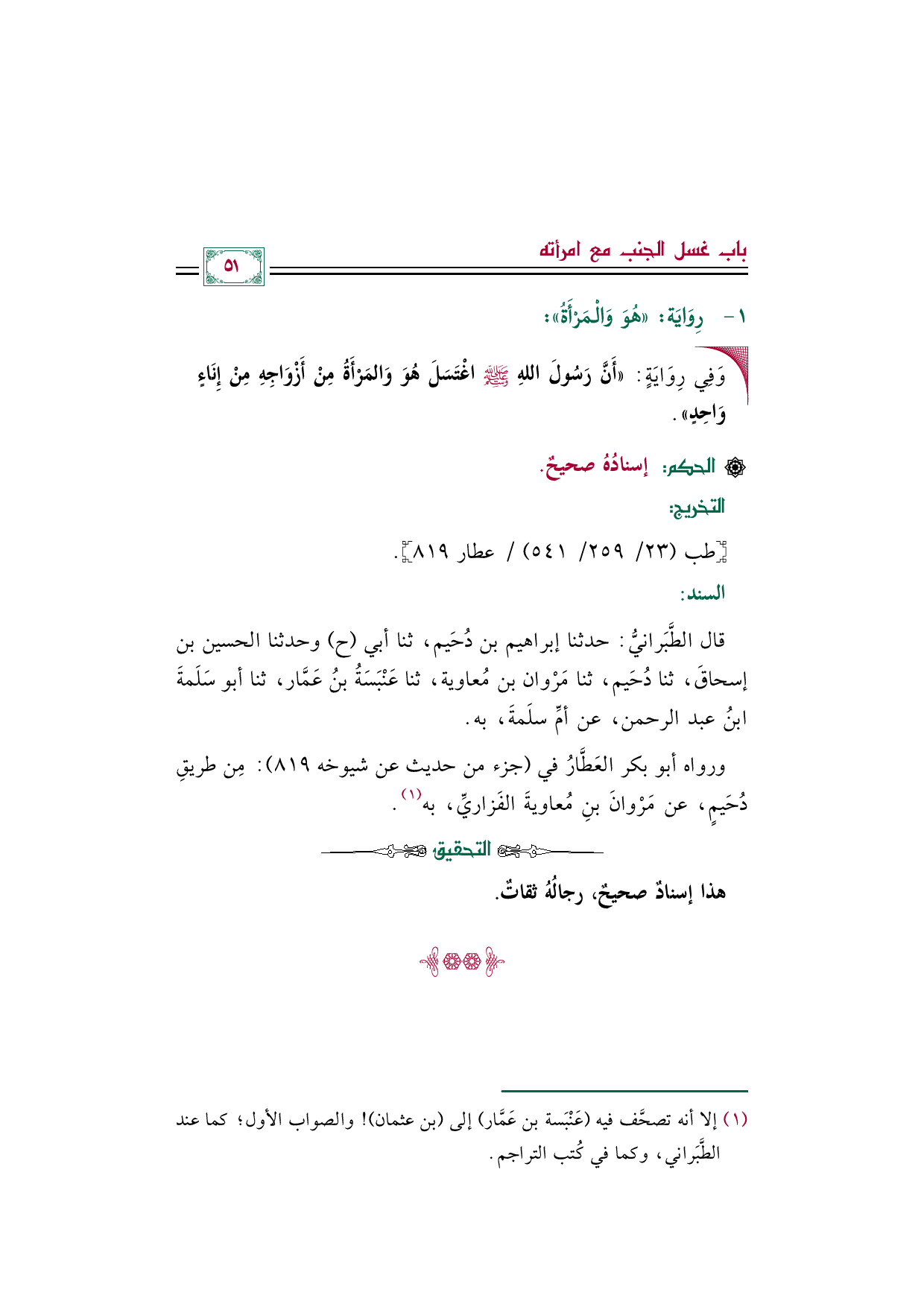 قال الطَّبَرانيُّ: حدثنا إبراهيم بن دُحَيم، ثنا أبي (ح) وحدثنا الحسين بن إسحاقَ، ثنا دُحَيم، ثنا مَرْوان بن مُعاوية، ثنا عَنْبَسَةُ بنُ عَمَّار، ثنا أبو سَلَمةَ بنُ عبد الرحمن، عن أمِّ سلَمةَ، به.