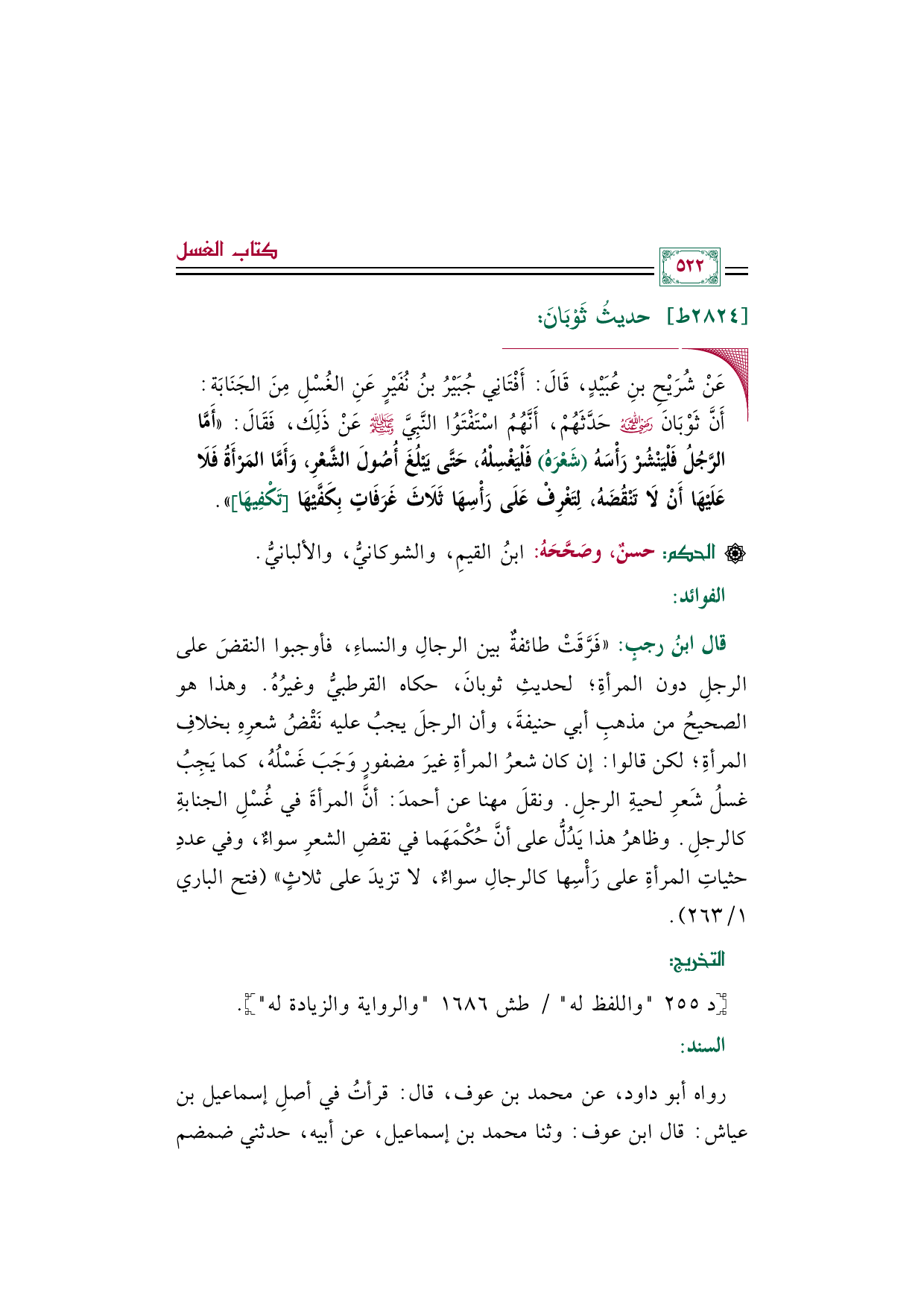 قال ابنُ رجبٍ: ((فَرَّقَتْ طائفةٌ بين الرجالِ والنساءِ، فأوجبوا النقضَ على الرجلِ دون المرأةِ؛ لحديثِ ثوبانَ، حكاه القرطبيُّ وغيرُهُ. وهذا هو الصحيحُ من مذهبِ أبي حنيفةَ، وأن الرجلَ يجبُ عليه نَقْضُ شعرِهِ بخلافِ المرأةِ؛ لكن قالوا: إن كان شعرُ المرأةِ غيرَ مضفورٍ وَجَبَ غَسْلُهُ، كما يَجِبُ غسلُ شَعرِ لحيةِ الرجلِ. ونقلَ مهنا عن أحمدَ: أنَّ المرأةَ في غُسْلِ الجنابةِ كالرجلِ. وظاهرُ هذا يَدُلُّ على أنَّ حُكْمَهَما في نقضِ الشعرِ سواءٌ، وفي عددِ حثياتِ المرأةِ على رَأْسِها كالرجالِ سواءٌ، لا تزيدَ على ثلاثٍ" (فتح الباري ١/ ٢٦٣).