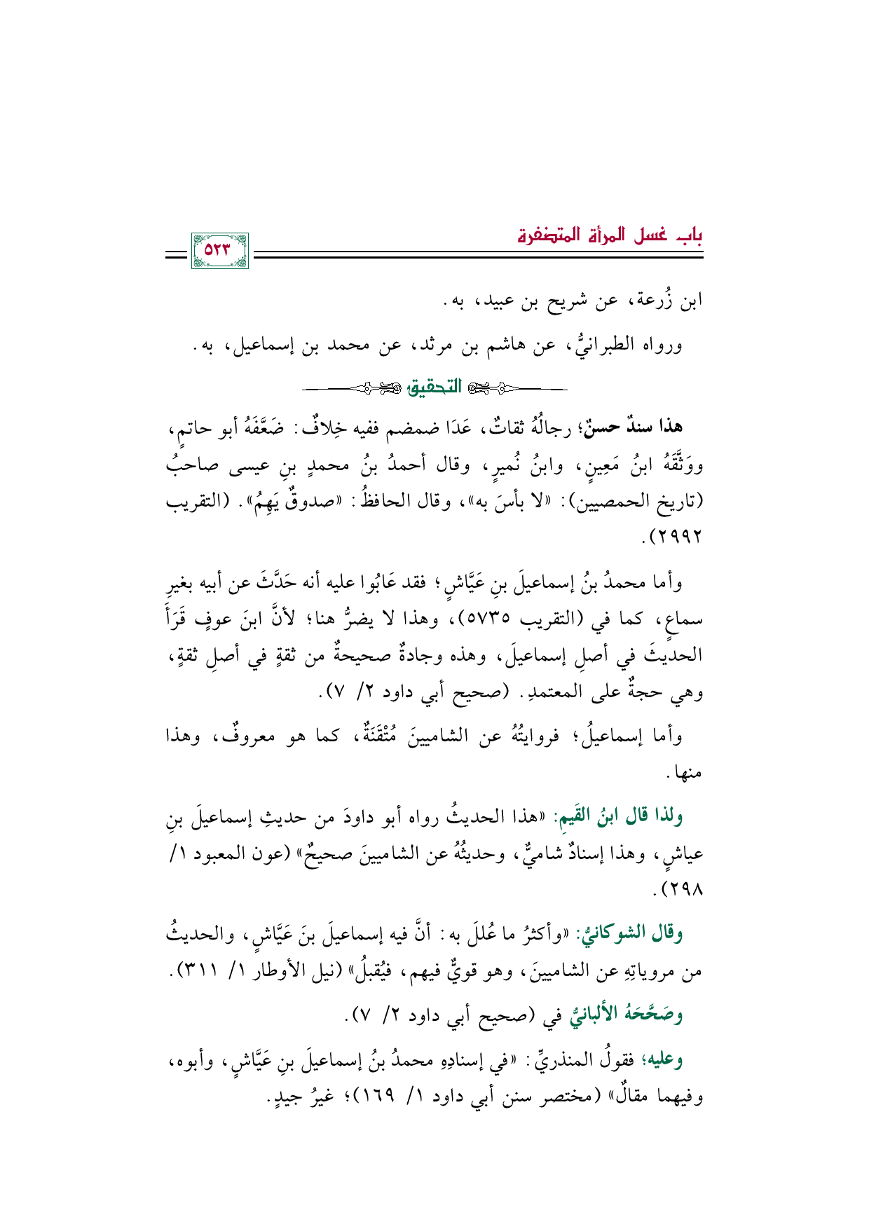 وقال الشوكانيُّ: "وأكثرُ ما عُللَ به: أنَّ فيه إسماعيلَ بنَ عَيَّاشٍ، والحديثُ من مروياتِهِ عن الشاميينَ، وهو قويٌّ فيهم، فيُقبلُ" (نيل الأوطار ١/ ٣١١).