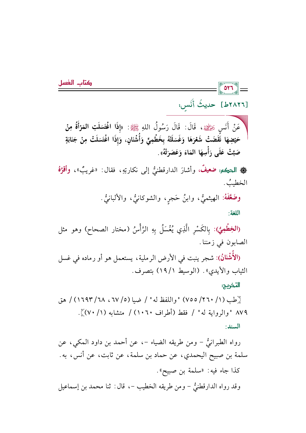 ◼ عَنْ أَنَسٍ رضي الله عنه، قَالَ: قَالَ رَسُولُ اللهِ صلى الله عليه وسلم: ((إِذَا اغْتَسَلَتِ المَرْأَةُ مِنْ حَيْضِهَا نَقَضَتْ شَعْرَهَا وَغَسَلَتْهُ بِخَطْمِيٍّ وَأُشْنَانٍ، وَإِذَا اغْتَسَلَتْ مِنْ جَنَابَةٍ صَبَّتْ عَلَى رَأْسِهَا المَاءَ وَعَصَرَتْهُ)).