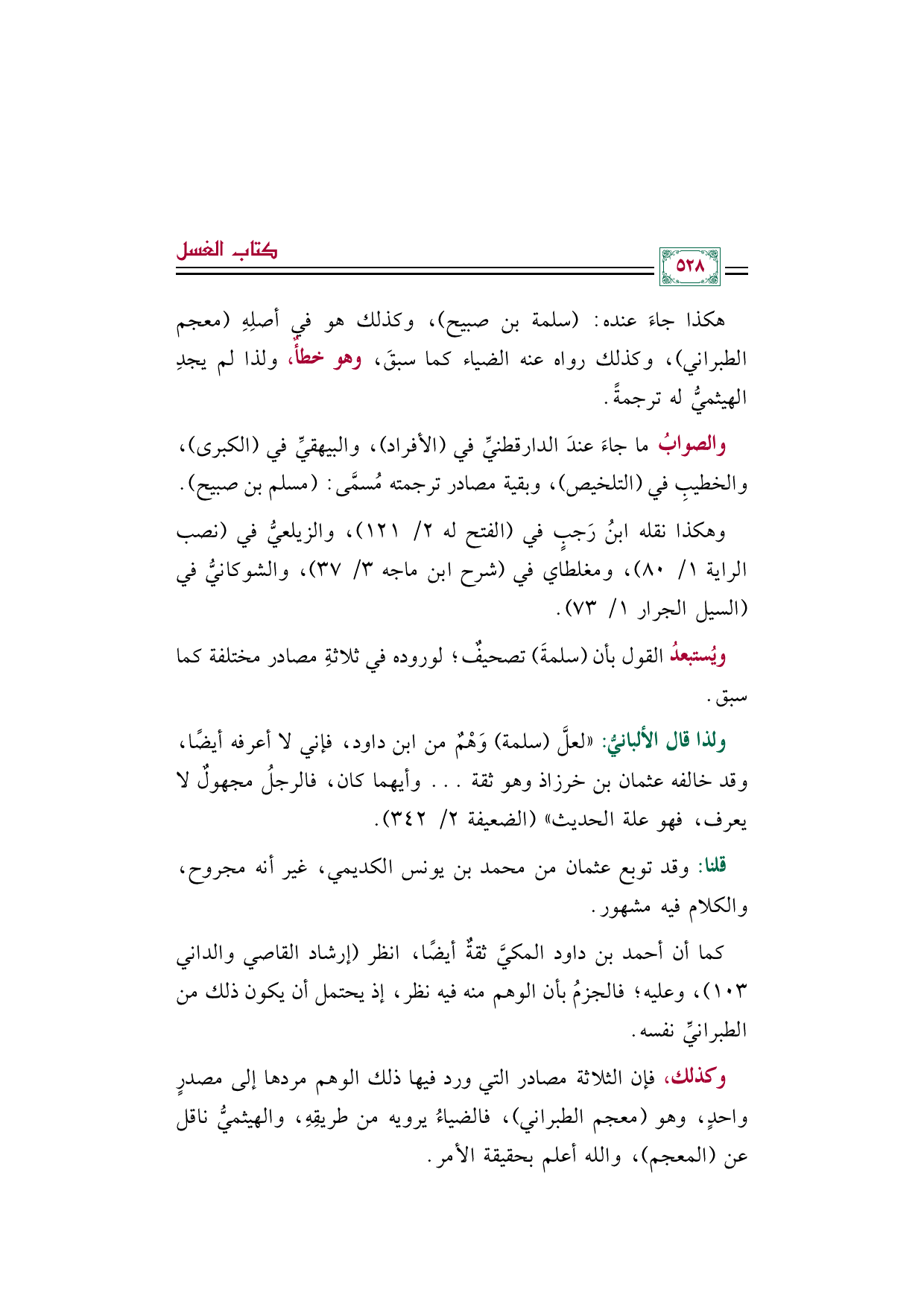 ولذا قال الألبانيُّ: "لعلَّ (سلمة) وَهْمٌ من ابن داود، فإني لا أعرفه أيضًا، وقد خالفه عثمان بن خرزاذ وهو ثقة ... وأيهما كان، فالرجلُ مجهولٌ لا يعرف، فهو علة الحديث" (الضعيفة ٢/ ٣٤٢).