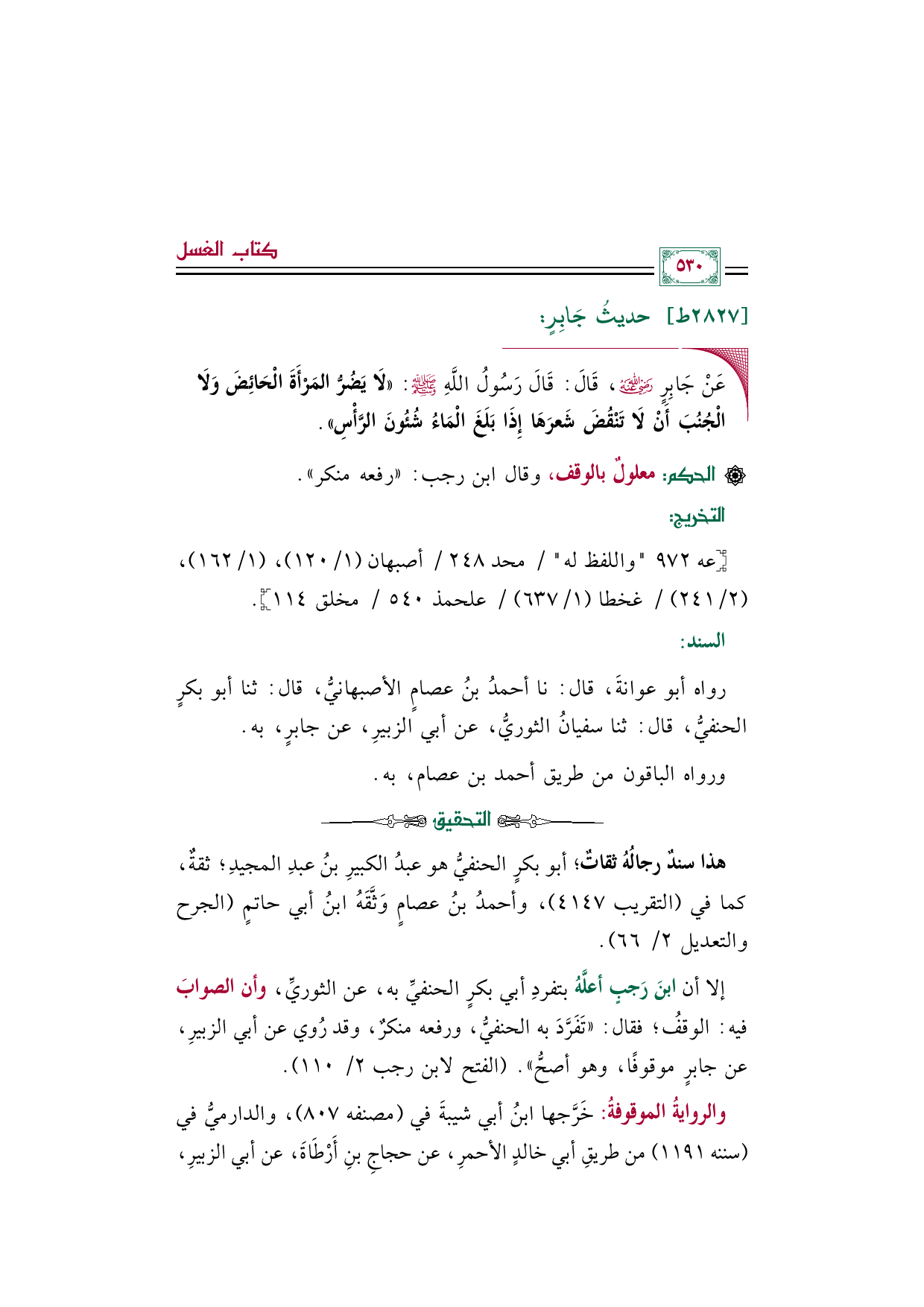 إلا أن ابنَ رَجبٍ أعلَّهُ بتفردِ أبي بكرٍ الحنفيِّ به، عن الثوريِّ، وأن الصوابَ فيه: الوقفُ؛ فقال: " تَفَرَّدَ به الحنفيُّ، ورفعه منكرٌ، وقد رُوي عن أبي الزبيرِ، عن جابرٍ موقوفًا، وهو أصحُّ". (الفتح لابن رجب ٢/ ١١٠).