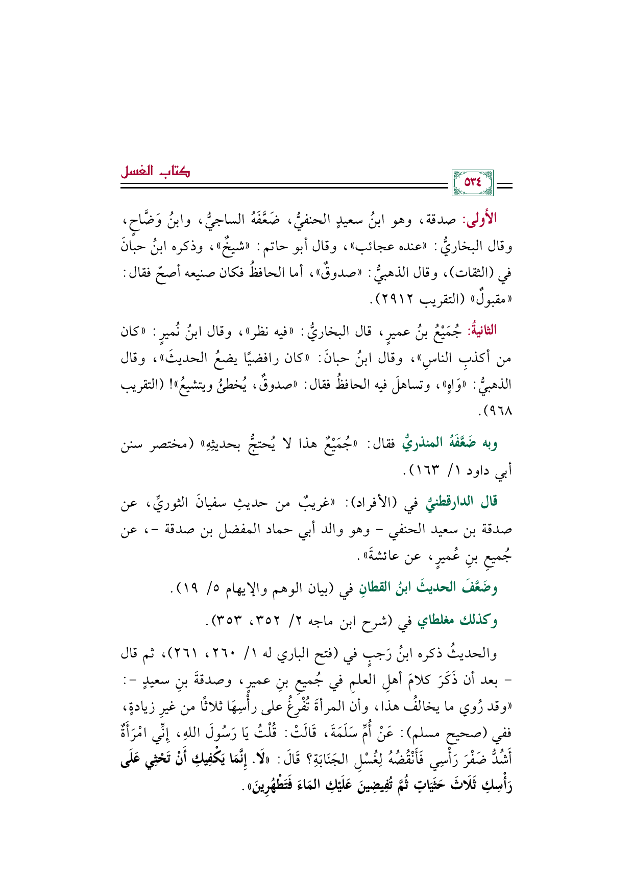 والحديثُ ذكره ابنُ رَجبٍ في (فتح الباري له ١/ ٢٦٠، ٢٦١)، ثم قال -بعد أن ذَكَرَ كلامَ أهلِ العلمِ في جُميعِ بنِ عميرٍ، وصدقةَ بنِ سعيدٍ-: "وقد رُوي ما يخالفُ هذا، وأن المرأةَ تُفْرِغُ على رأْسِهَا ثلاثًا من غيرِ زيادةٍ، ففي (صحيح مسلم): عَنْ أُمِّ سَلَمَةَ، قَالَتْ: قُلْتُ يَا رَسُولَ اللهِ، إِنِّي امْرَأَةٌ أَشُدُّ ضَفْرَ رَأْسِي فَأَنْقُضُهُ لِغُسْلِ الجَنَابَةِ؟ قَالَ: ((لَا. إِنَّمَا يَكْفِيكِ أَنْ تَحْثِي عَلَى رَأْسِكِ ثَلَاثَ حَثَيَاتٍ ثُمَّ تُفِيضِينَ عَلَيْكِ المَاءَ فَتَطْهُرِينَ)).
