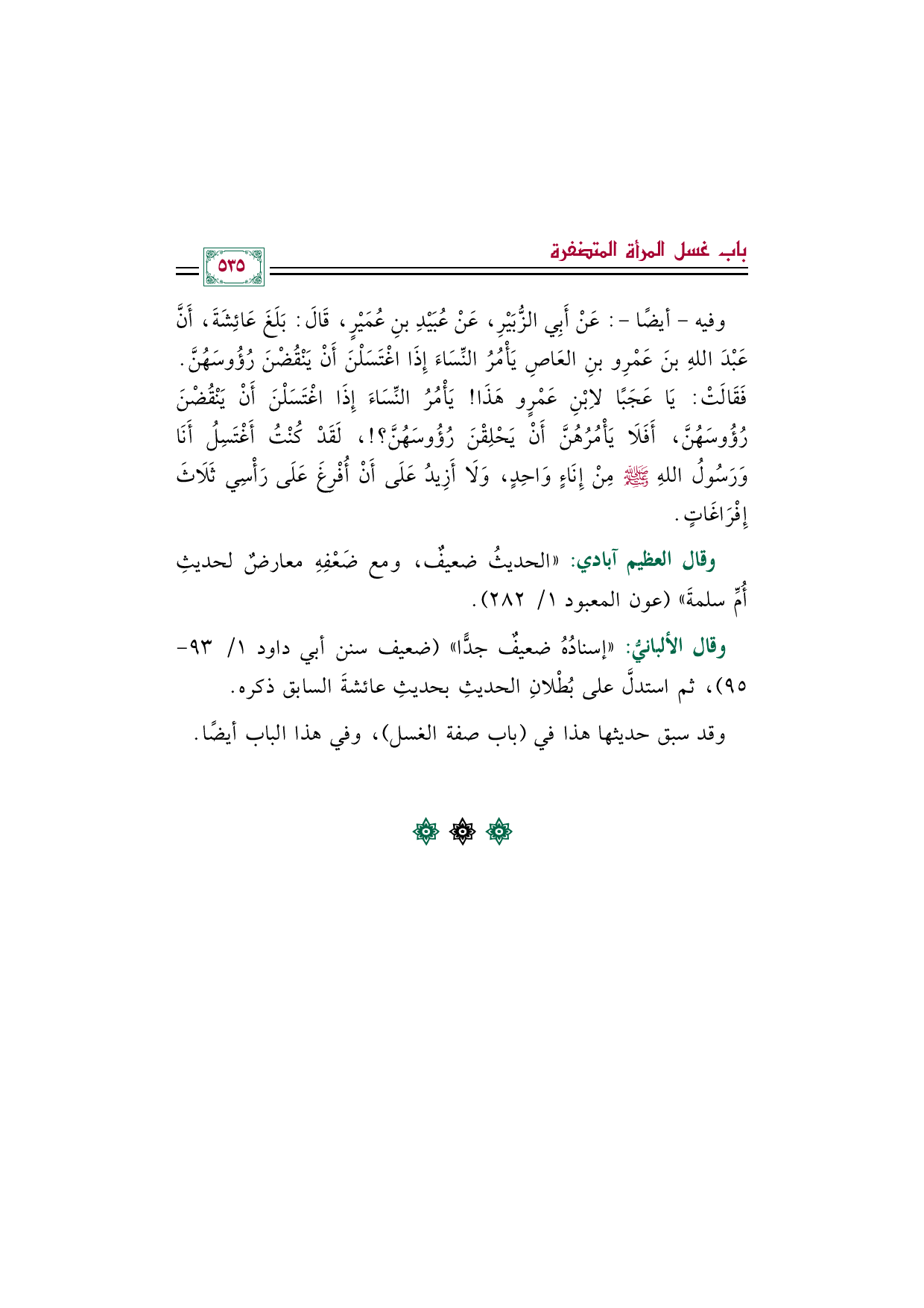 وقال العظيم آبادي: "الحديثُ ضعيفٌ، ومع ضَعْفِهِ معارضٌ لحديثِ أُمِّ سلمةَ" (عون المعبود ١/ ٢٨٢).