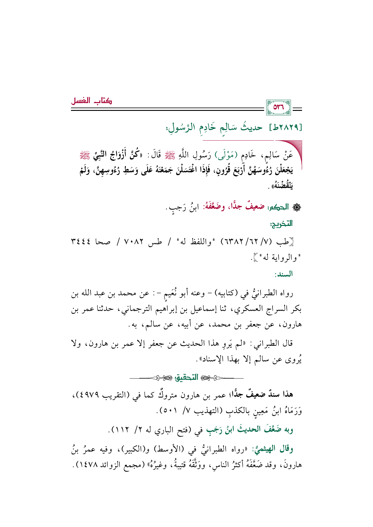 قال الطبراني: "لم يَروِ هذا الحديث عن جعفر إلا عمر بن هارون، ولا يُروى عن سالم إلا بهذا الإسناد".