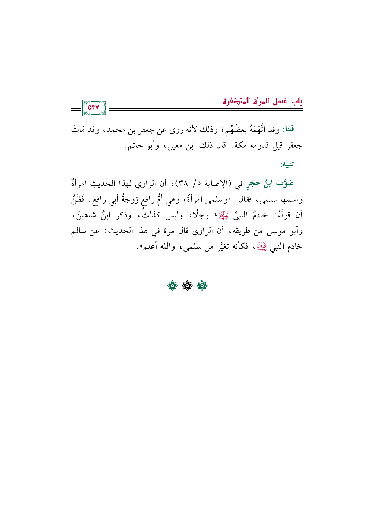 صَوَّبَ ابنُ حَجَرٍ في (الإصابة ٥/ ٣٨)، أن الراوي لهذا الحديثِ امرأةٌ واسمها سلمى، فقال: "وسلمى امرأةٌ، وهي أمُّ رافعٍ زوجةُ أبي رافع، فَظَنَّ أن قولَهُ: خادمُ النبيِّ صلى الله عليه وسلم؛ رجلًا، وليس كذلك، وذكر ابنُ شاهينَ، وأبو موسى من طريقه، أن الراوي قال مرة في هذا الحديث: عن سالم خادم النبي صلى الله عليه وسلم، فكأنه تغيَّر من سلمى، والله أعلم".