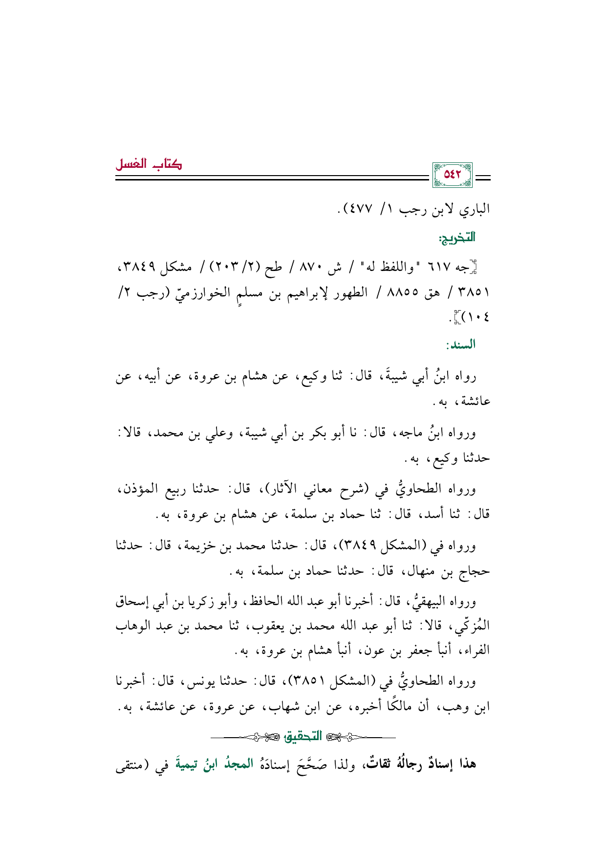 ورواه الطحاويُّ في (شرح معاني الآثار)، قال: حدثنا ربيع المؤذن، قال: ثنا أسد، قال: ثنا حماد بن سلمة، عن هشام بن عروة، به.