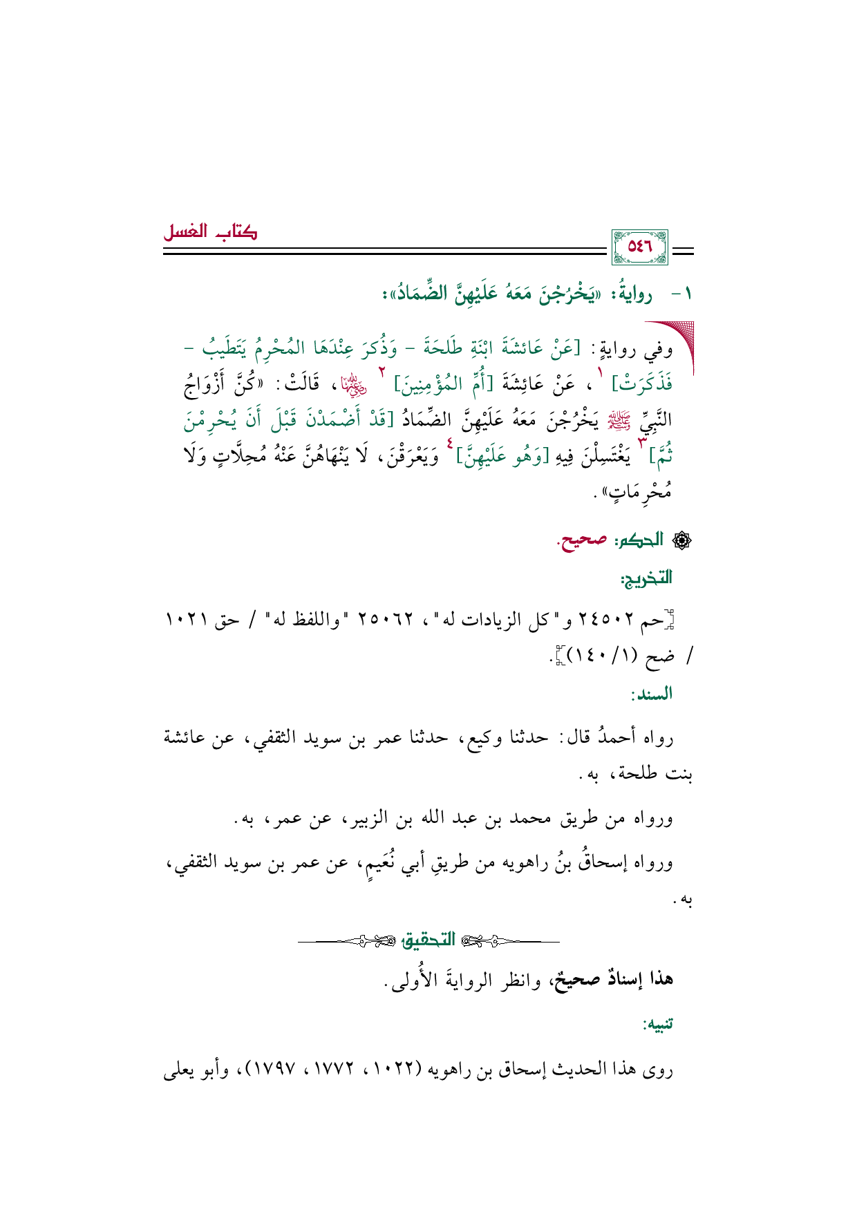 • وفي روايةٍ: [عَنْ عَائشَةَ ابْنَةِ طَلحَةَ -وَذُكرَ عِنْدَهَا المُحْرِمُ يَتَطَيبُ- فَذَكَرَتْ] ١، عَنْ عَائِشَةَ [أُمِّ المُؤْمِنِينَ] ٢ رضي الله عنها، قَالَتْ: ((كُنَّ أَزْوَاجُ النَّبِيِّ صلى الله عليه وسلم يَخْرُجْنَ مَعَهُ عَلَيْهِنَّ الضِّمَادُ [قَدْ أَضْمَدْنَ قَبْلَ أَنَ يُحْرِمْنَ ثُمَّ] ٣ يَغْتَسِلْنَ فِيهِ [وَهُو عَلَيْهِنَّ] ٤ وَيَعْرَقْنَ، لَا يَنْهَاهُنَّ عَنْهُ مُحِلَّاتٍ وَلَا مُحْرِمَاتٍ))