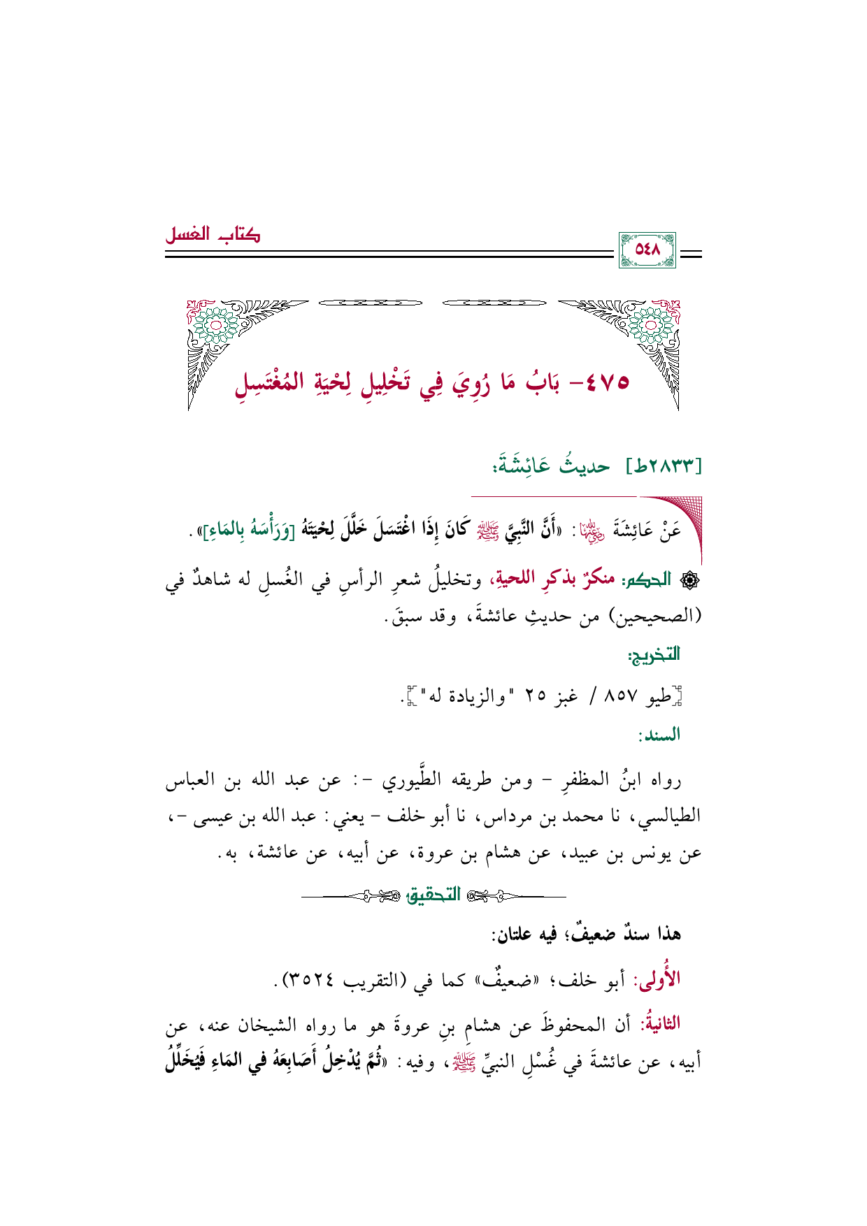 ◼ عَنْ عَائِشَةَ رضي الله عنها: ((أَنَّ النَّبِيَّ صلى الله عليه وسلم كَانَ إِذَا اغْتَسَلَ خَلَّلَ لِحْيَتَهُ [وَرَأْسَهُ بِالمَاءِ])).