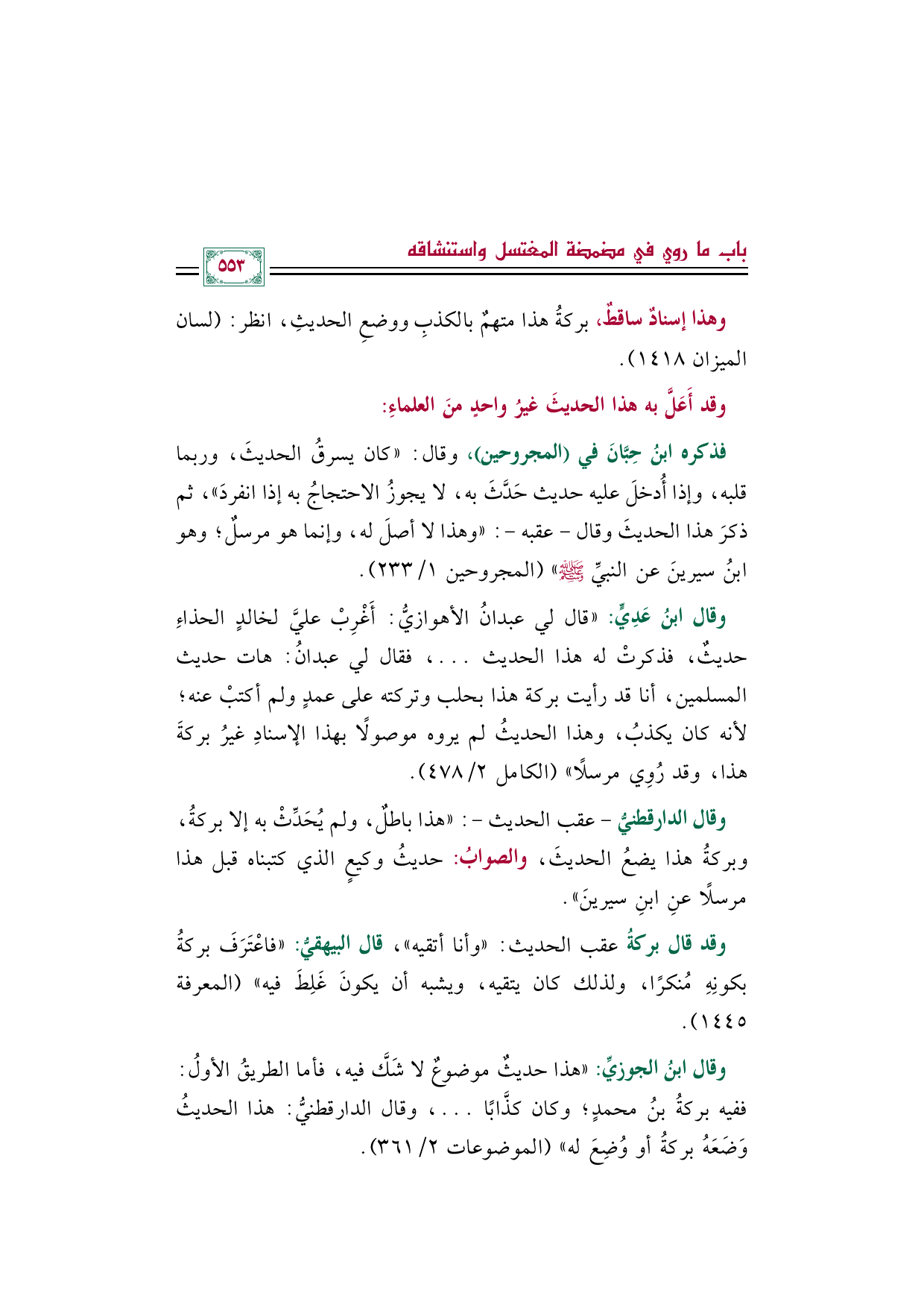وقال الدارقطنيُّ -عقب الحديث-: "هذا باطلٌ، ولم يُحَدِّثْ به إلا بركةُ، وبركةُ هذا يضعُ الحديثَ، والصوابُ: حديثُ وكيعٍ الذي كتبناه قبل هذا مرسلًا عنِ ابنِ سيرينَ".