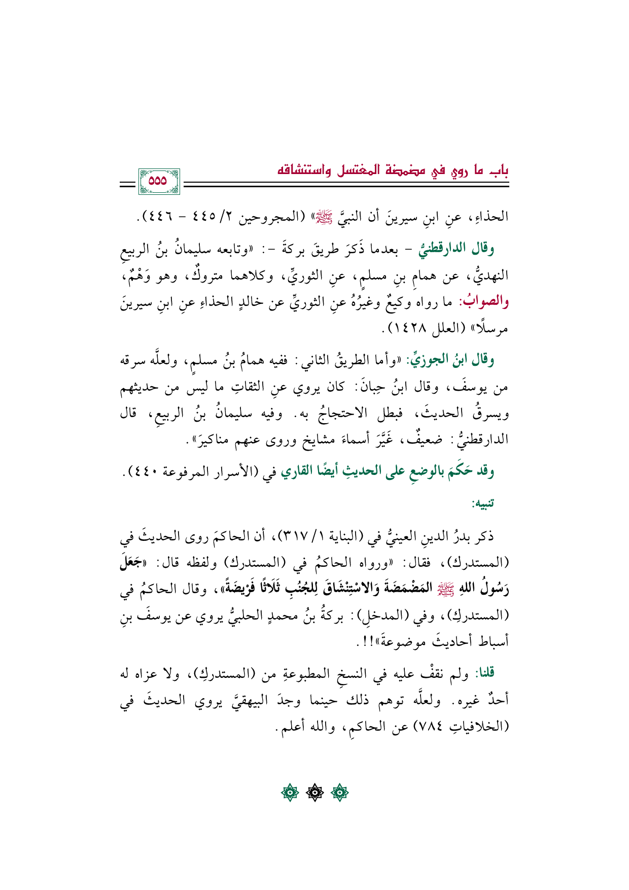 ذكر بدرُ الدينِ العينيُّ في (البناية ١/ ٣١٧)، أن الحاكمَ روى الحديثَ في (المستدرك)، فقال: "ورواه الحاكمُ في (المستدرك) ولفظه قال: ((جَعَلَ رَسُولُ اللهِ صلى الله عليه وسلم المَضْمَضَةَ وَالاسْتِنْشَاقَ لِلجُنُبِ ثَلَاثًا فَرْيضَةً))، وقال الحاكمُ في (المستدركِ)، وفي (المدخلِ): بركةُ بنُ محمدٍ الحلبيُّ يروي عن يوسفَ بنِ أسباط أحاديثَ موضوعةَ"!!.
