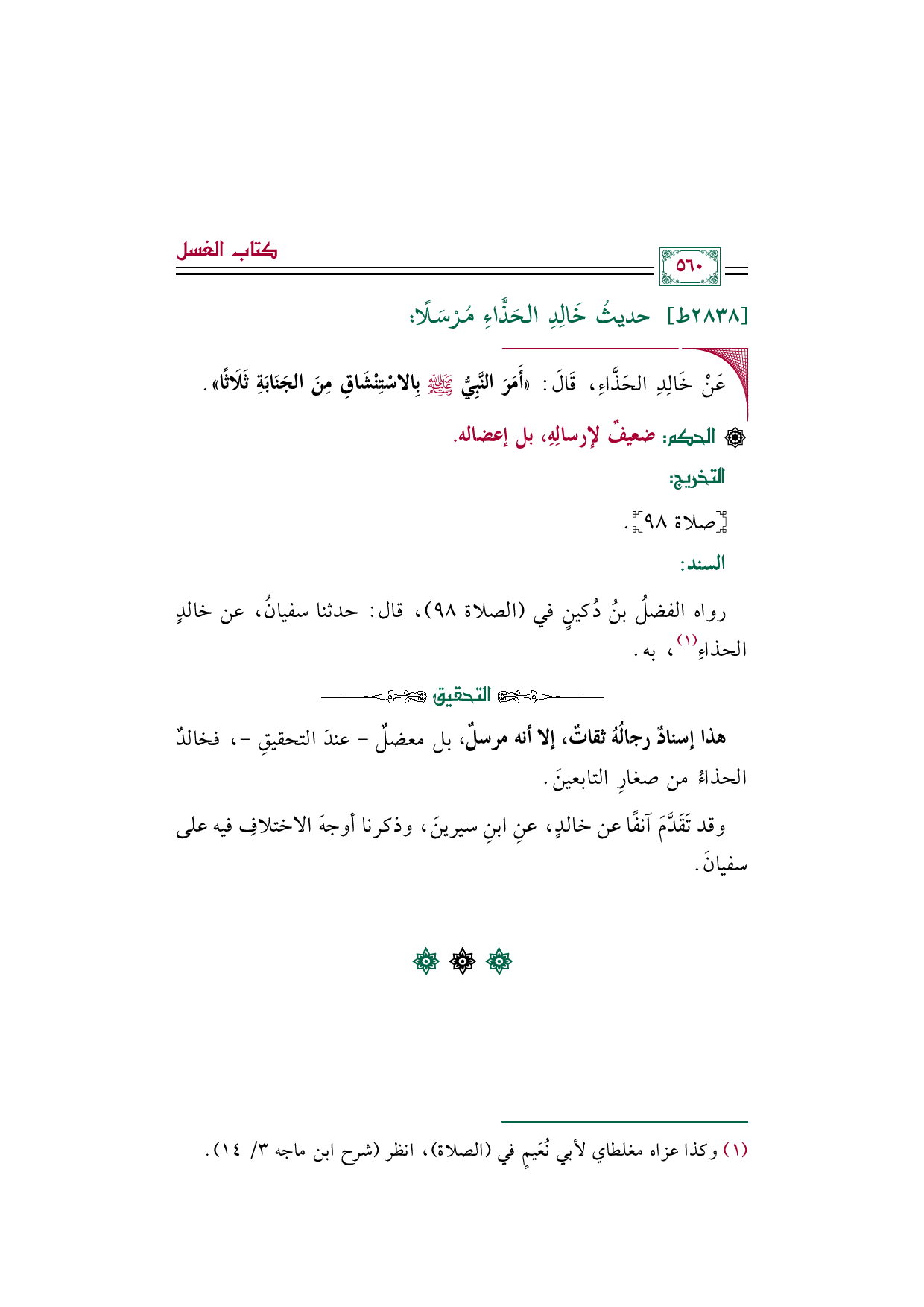 ◼ عَنْ خَالِدِ الحَذَّاءِ، قَالَ: ((أَمَرَ النَّبِيُّ صلى الله عليه وسلم بِالاسْتِنْشَاقِ مِنَ الجَنَابَةِ ثَلَاثًا)).