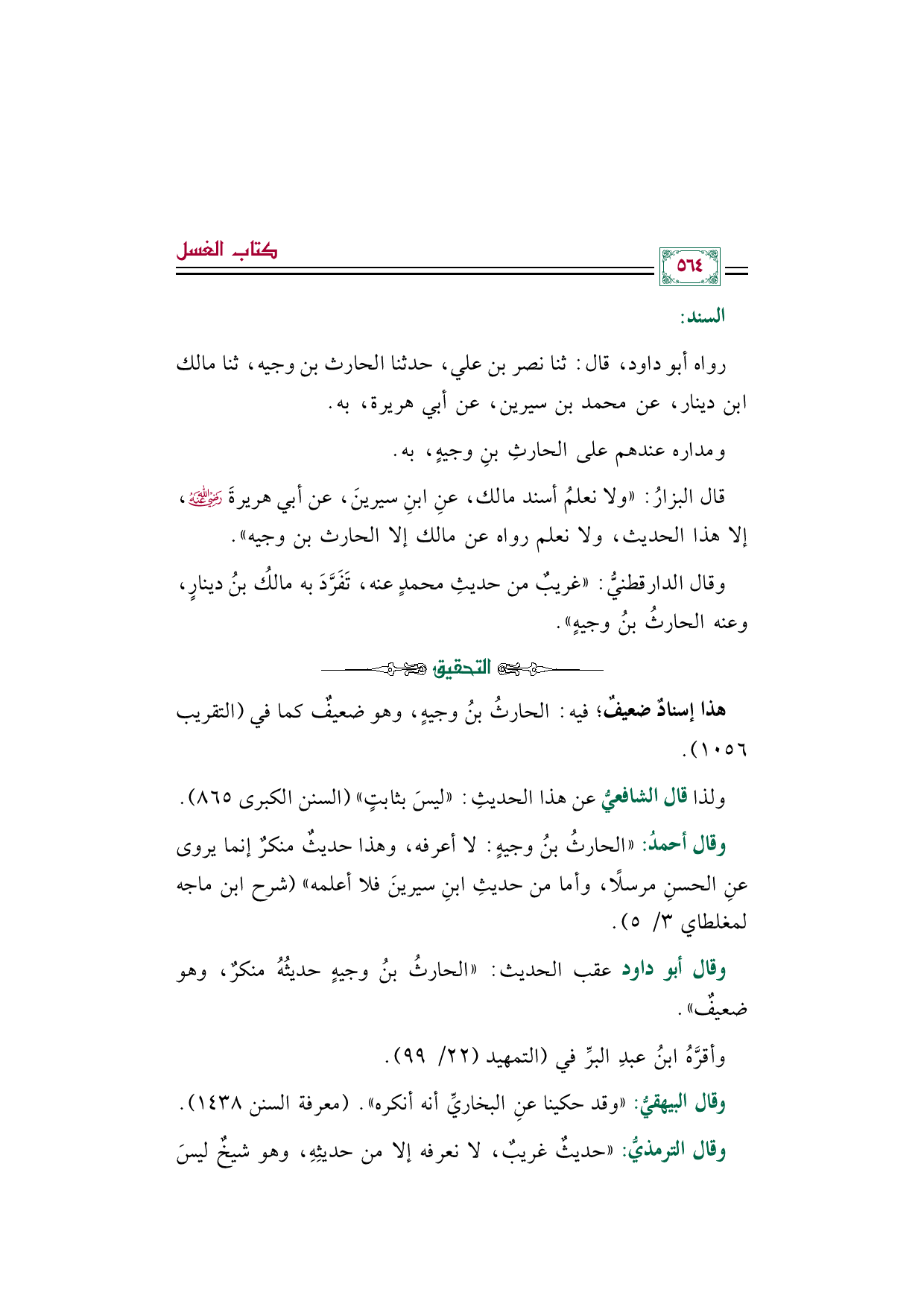 رواه أبو داود، قال: ثنا نصر بن علي، حدثنا الحارث بن وجيه، ثنا مالك بن دينار، عن محمد بن سيرين، عن أبي هريرة، به.