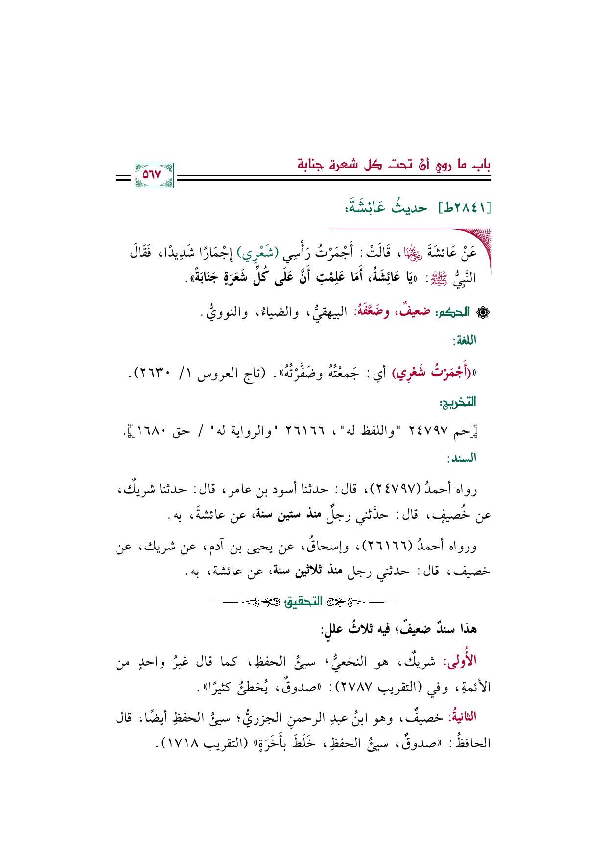 ورواه أحمدُ (٢٦١٦٦)، وإسحاقُ، عن يحيى بن آدم، عن شريك، عن خصيف، قال: حدثني رجل منذ ثلاثين سنة، عن عائشة، به.