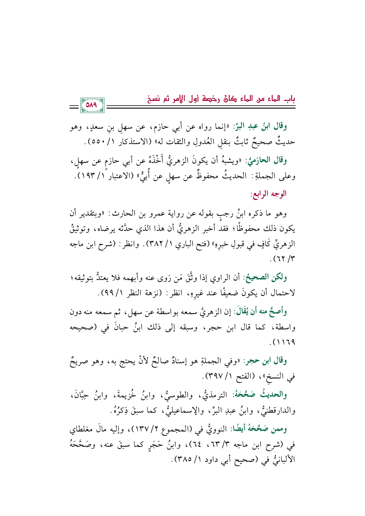 وهو ما ذكره ابنُ رجبٍ بقوله عن رواية عمرو بن الحارث: "وبتقدير أن يكون ذلك محفوظًا؛ فقد أخبر الزهريُّ أن هذا الذي حدَّثه يرضاه، وتوثيقُ الزهريِّ كَافٍ في قبولِ خبرِهِ" (فتح الباري ١/ ٣٨٢). وانظر: (شرح ابن ماجه ٣/ ٦٢).