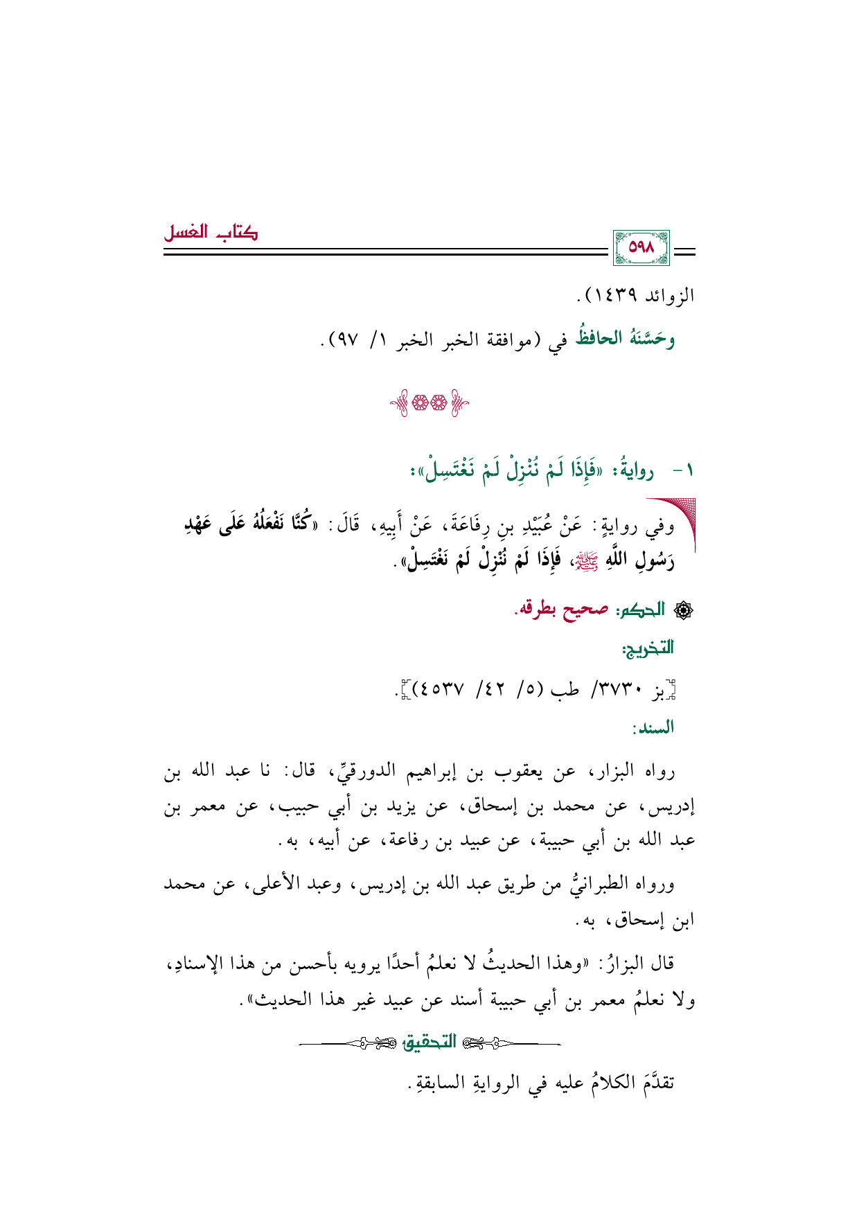 رواه البزار، عن يعقوب بن إبراهيم الدورقيِّ، قال: نا عبد الله بن إدريس، عن محمد بن إسحاق، عن يزيد بن أبي حبيب، عن معمر بن عبد الله بن أبي حبيبة، عن عبيد بن رفاعة، عن أبيه، به.