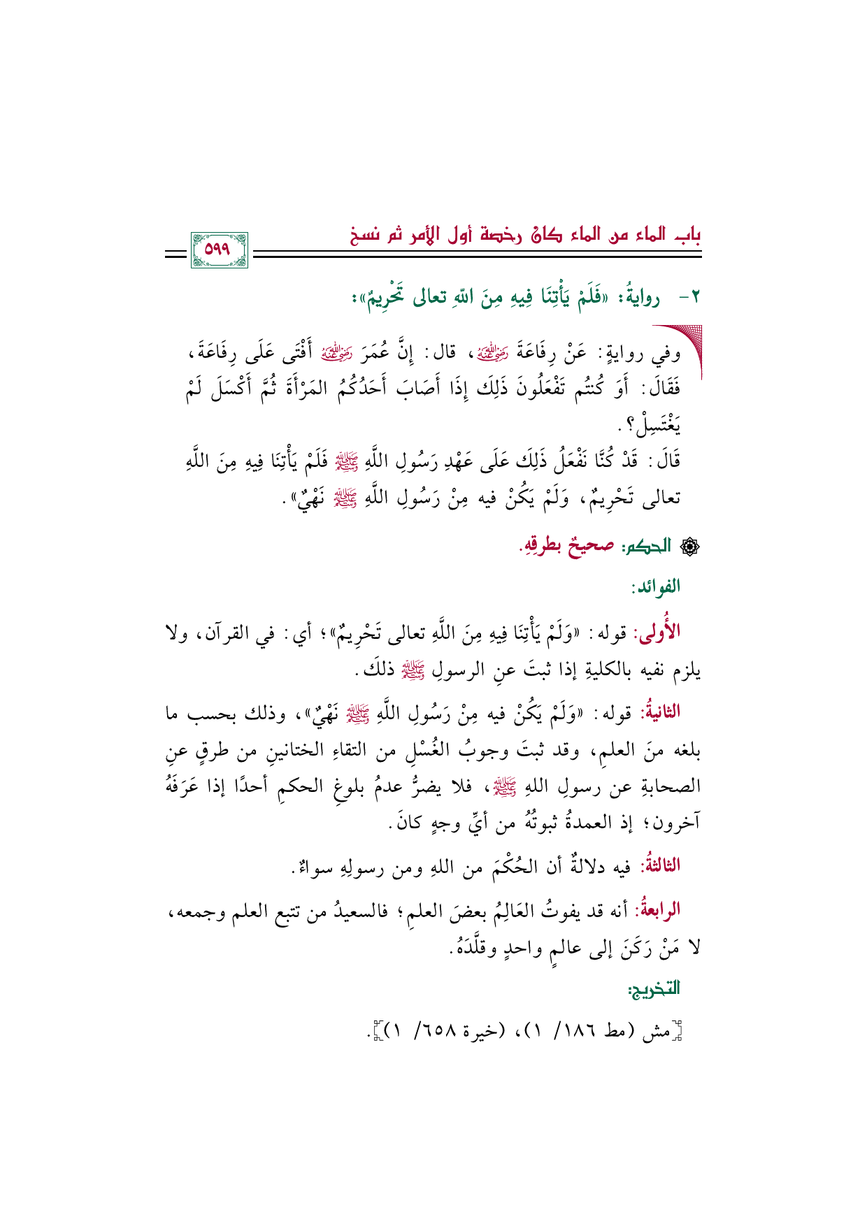 الثانيةُ: قوله: ((وَلَمْ يَكُنْ فيه مِنْ رَسُولِ اللَّهِ صلى الله عليه وسلم نَهْيٌ))، وذلك بحسب ما بلغه منَ العلمِ، وقد ثبتَ وجوبُ الغُسْلِ من التقاءِ الختانينِ من طرقٍ عنِ الصحابةِ عن رسولِ اللهِ صلى الله عليه وسلم، فلا يضرُّ عدمُ بلوغِ الحكمِ أحدًا إذا عَرَفَهُ آخرون؛ إذ العمدةُ ثبوتُهُ من أيِّ وجهٍ كانَ.