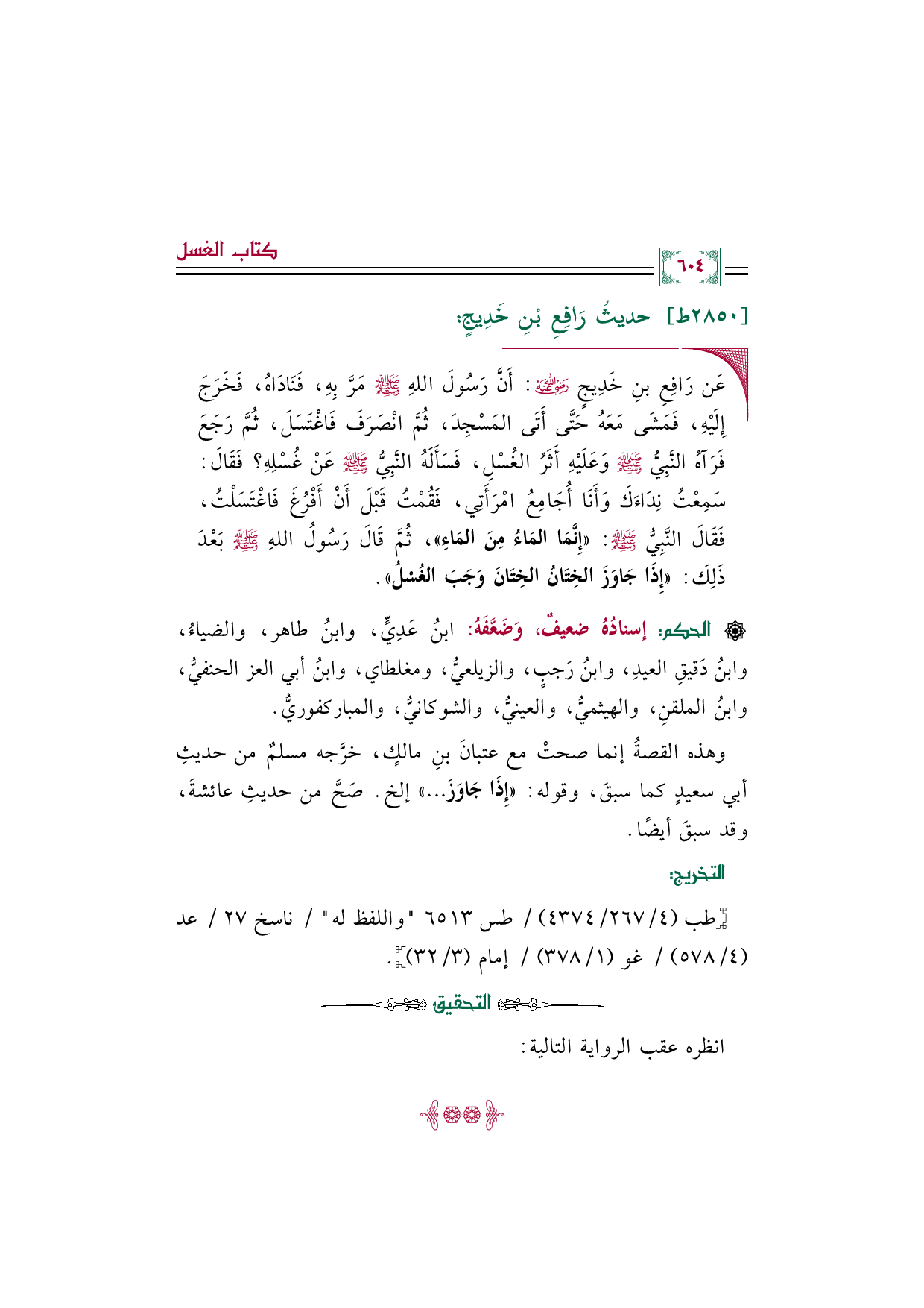 ◼ عَن رَافِعِ بنِ خَدِيجٍ رضي الله عنه: أَنَّ رَسُولَ اللهِ صلى الله عليه وسلم مَرَّ بِهِ، فَنَادَاهُ، فَخَرَجَ إِلَيْهِ، فَمَشَى مَعَهُ حَتَّى أَتَى المَسْجِدَ، ثُمَّ انْصَرَفَ فَاغْتَسَلَ، ثُمَّ رَجَعَ فَرَآهُ النَّبِيُّ صلى الله عليه وسلم وَعَلَيْهِ أَثَرُ الغُسْلِ، فَسَأَلَهُ النَّبِيُّ صلى الله عليه وسلم عَنْ غُسْلِهِ؟ فَقَالَ: سَمِعْتُ نِدَاءَكَ وَأَنَا أُجَامِعُ امْرَأَتِي، فَقُمْتُ قَبْلَ أَنْ أَفْرُغَ فَاغْتَسَلْتُ، فَقَالَ النَّبِيُّ صلى الله عليه وسلم: ((إِنَّمَا المَاءُ مِنَ المَاءِ))، ثُمَّ قَالَ رَسُولُ اللهِ صلى الله عليه وسلم بَعْدَ ذَلِكَ: ((إِذَا جَاوَزَ الخِتَانُ الخِتَانَ وَجَبَ الغُسْلُ)).