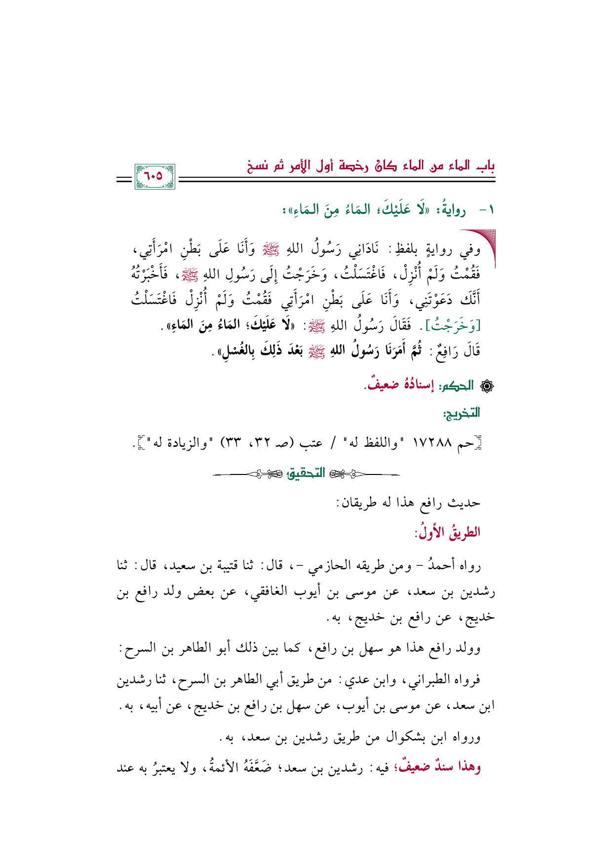 • وفي روايةٍ بلفظِ: نَادَانِي رَسُولُ اللهِ صلى الله عليه وسلم وَأَنَا عَلَى بَطْنِ امْرَأَتِي، فَقُمْتُ وَلَمْ أُنْزِلْ، فَاغْتَسَلْتُ، وَخَرَجْتُ إِلَى رَسُولِ اللهِ صلى الله عليه وسلم، فَأَخْبَرْتُهُ أَنَّكَ دَعَوْتَنِي، وَأَنَا عَلَى بَطْنِ امْرَأَتِي فَقُمْتُ وَلَمْ أُنْزِلْ فَاغْتَسَلْتُ [وَخَرَجْتُ]. فَقَالَ رَسُولُ اللهِ صلى الله عليه وسلم: ((لَا عَلَيْكَ؛ المَاءُ مِنَ المَاءِ)).