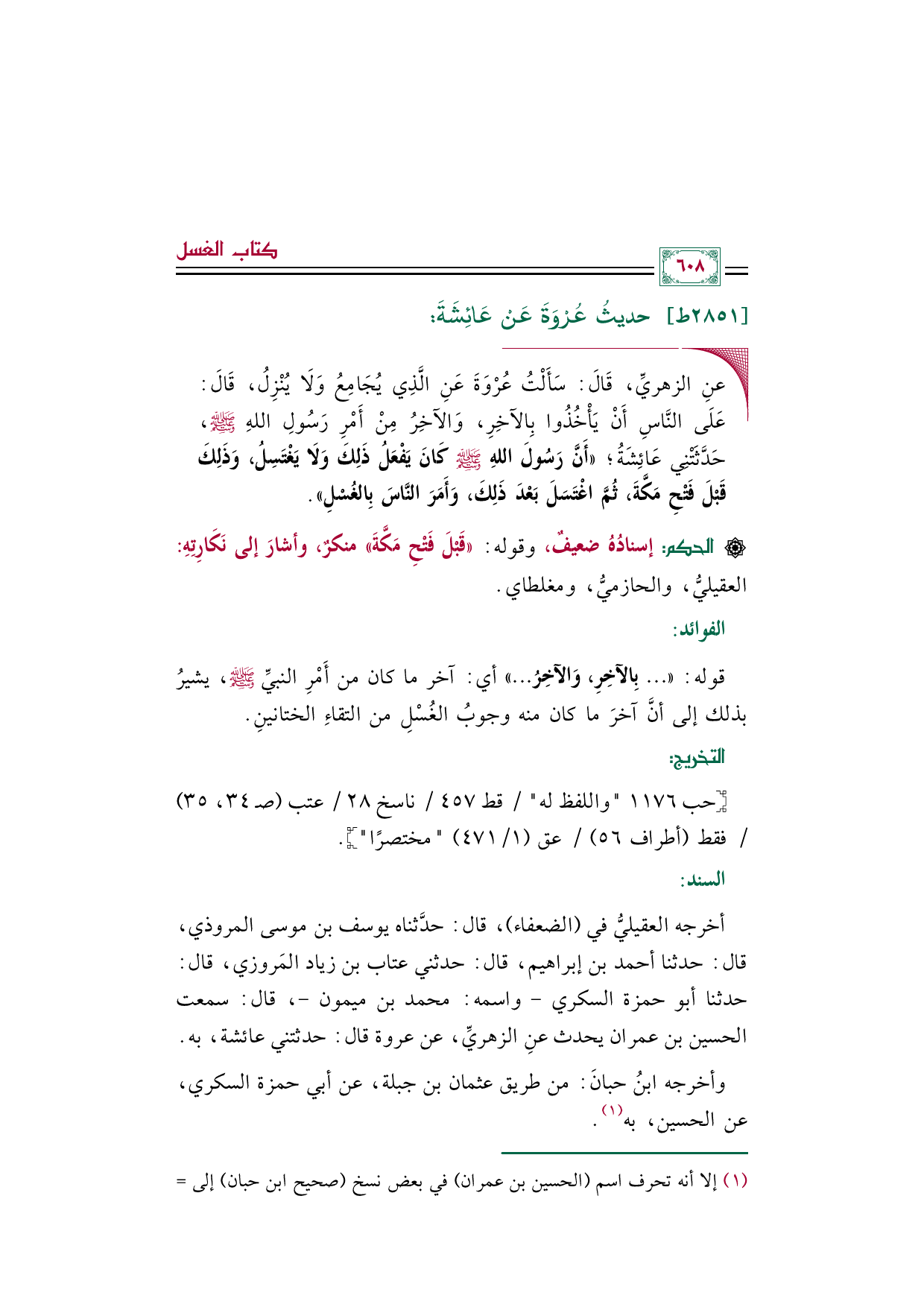 أخرجه العقيليُّ في (الضعفاء)، قال: حدَّثناه يوسف بن موسى المروذي، قال: حدثنا أحمد بن إبراهيم، قال: حدثني عتاب بن زياد المَروزي، قال: حدثنا أبو حمزة السكري-واسمه: محمد بن ميمون-، قال: سمعت الحسين بن عمران يحدث عنِ الزهريِّ، عن عروة قال: حدثتني عائشة، به.