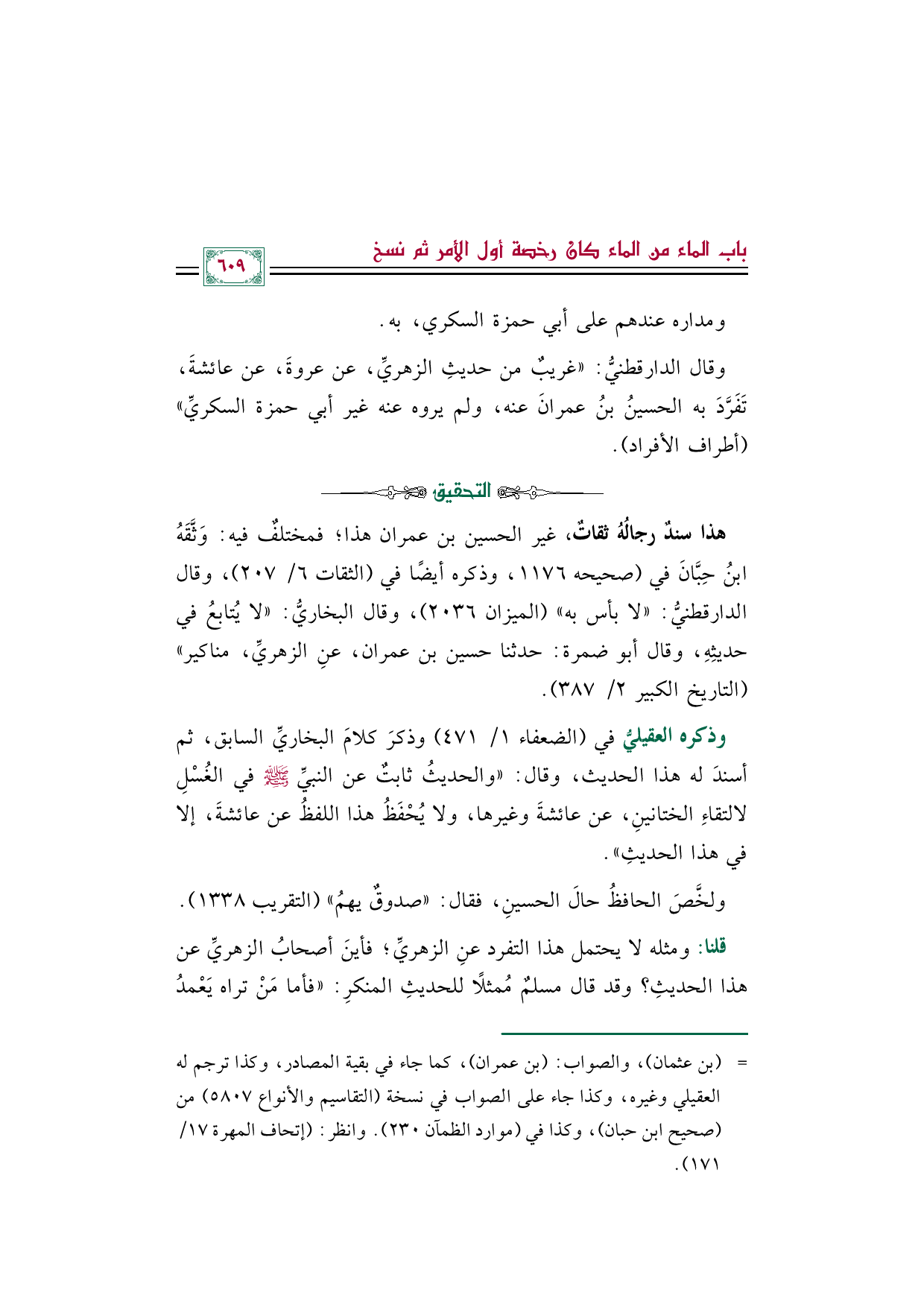 وقال الدارقطنيُّ: "غريبٌ من حديثِ الزهريِّ، عن عروةَ، عن عائشةَ، تَفَرَّدَ به الحسينُ بنُ عمرانَ عنه، ولم يروه عنه غير أبي حمزة السكريِّ" (أطراف الأفراد).