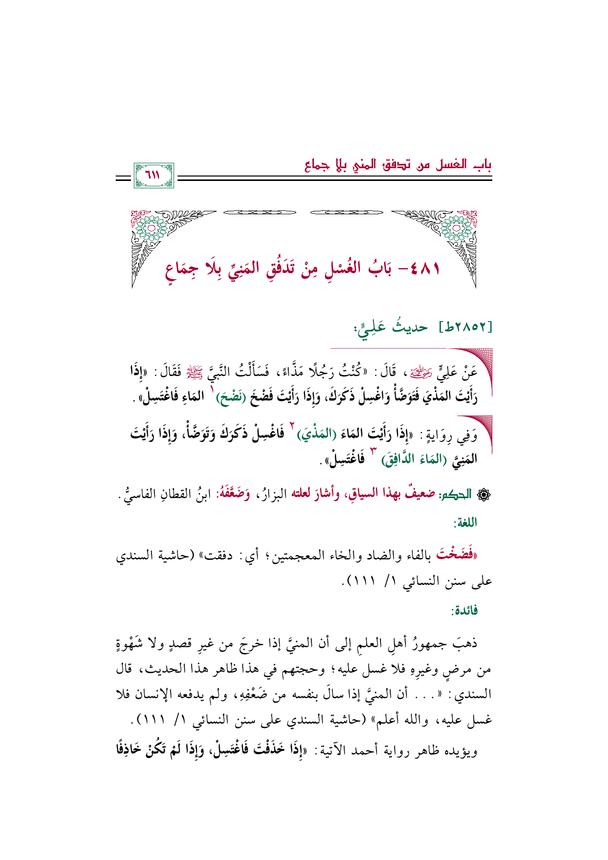 ذهبَ جمهورُ أهلِ العلمِ إلى أن المنيَّ إذا خرجَ من غيرِ قصدٍ ولا شَهْوةٍ من مرضٍ وغيرِهِ فلا غسل عليه؛ وحجتهم في هذا ظاهر هذا الحديث، قال السندي: " ... أن المنيَّ إذا سالَ بنفسه من ضَعْفِهِ، ولم يدفعه الإنسان فلا غسل عليه، والله أعلم" (حاشية السندي على سنن النسائي ١/ ١١١).