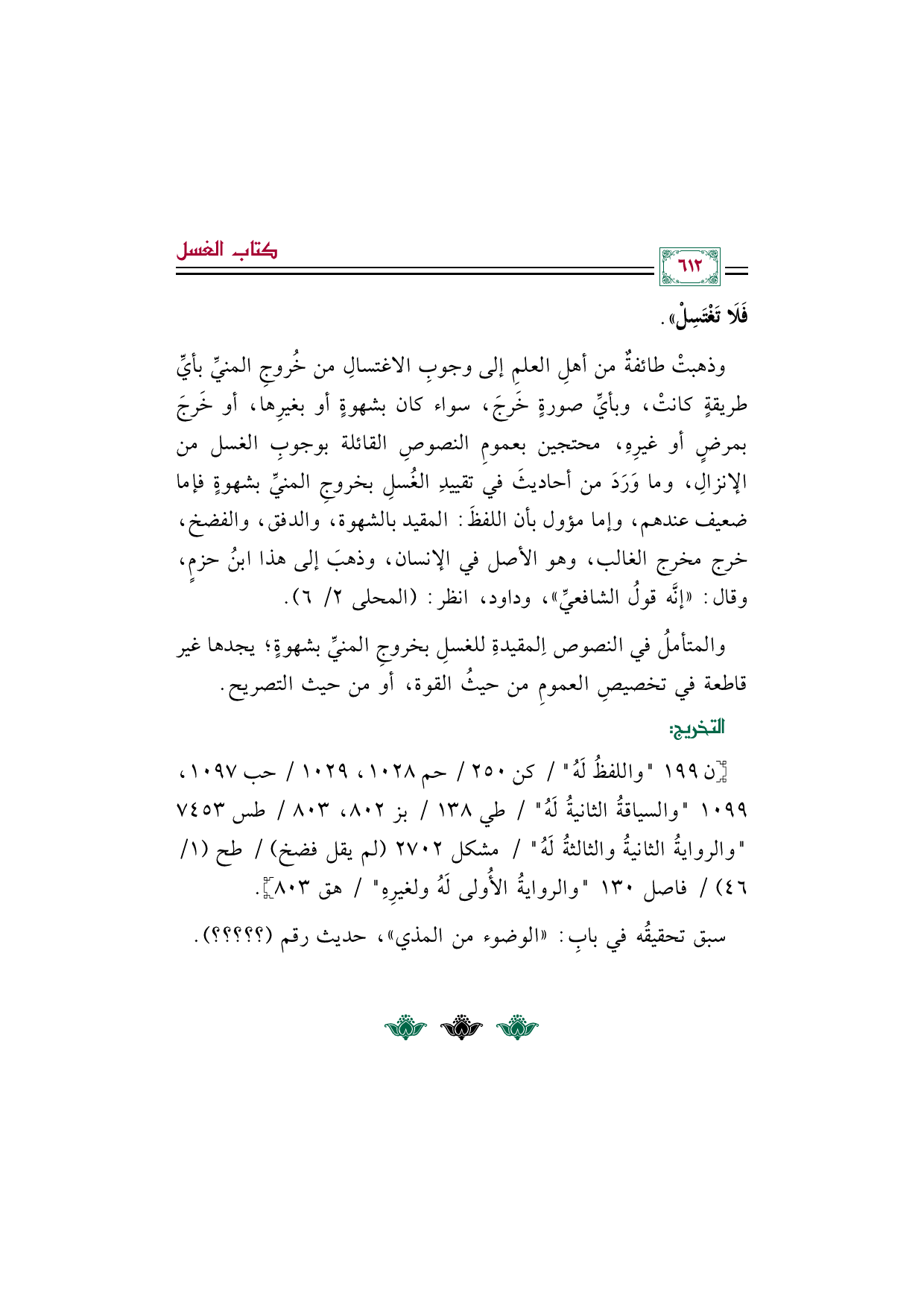 وذهبتْ طائفةٌ من أهلِ العلمِ إلى وجوبِ الاغتسالِ من خُروجِ المنيِّ بأيِّ طريقةٍ كانتْ، وبأيِّ صورةٍ خَرجَ، سواء كان بشهوةٍ أو بغيرِها، أو خَرجَ بمرضٍ أو غيرِهِ، محتجين بعمومِ النصوصِ القائلة بوجوبِ الغسل من الإنزالِ، وما وَرَدَ من أحاديثَ في تقييدِ الغُسلِ بخروجِ المنيِّ بشهوةٍ فإما ضعيف عندهم، وإما مؤول بأن اللفظَ: المقيد بالشهوة، والدفق، والفضخ، خرج مخرج الغالب، وهو الأصل في الإنسان، وذهبَ إلى هذا ابنُ حزمٍ، وقال: "إنَّه قولُ الشافعيِّ"، وداود، انظر: (المحلى ٢/ ٦).