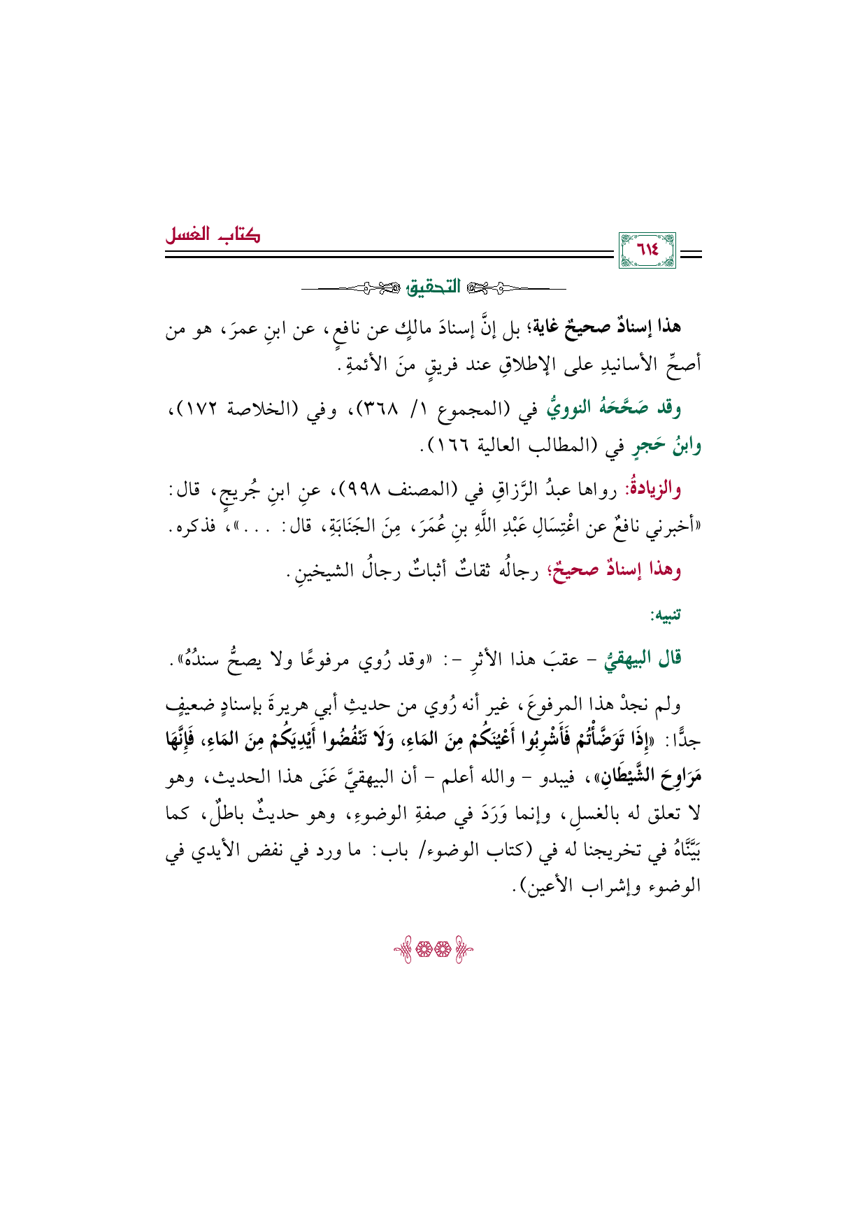 ولم نجدْ هذا المرفوعَ، غير أنه رُوي من حديثِ أبي هريرةَ بإسنادٍ ضعيفٍ جدًّا: ((إِذَا تَوَضَّأْتُمْ فَأَشْرِبُوا أَعْيُنَكُمْ مِنَ المَاءِ، وَلَا تَنْفُضُوا أَيْدِيَكُمْ مِنَ المَاءِ، فَإِنَّهَا مَرَاوِحَ الشَّيْطَانِ))، فيبدو -والله أعلم- أن البيهقيَّ عَنَى هذا الحديث، وهو لا تعلق له بالغسلِ، وإنما وَرَدَ في صفةِ الوضوءِ، وهو حديثٌ باطلٌ، كما بَيَّنَّاهُ في تخريجنا له في (كتاب الوضوء/ باب: ما ورد في نفض الأيدي في الوضوء وإشراب الأعين).
