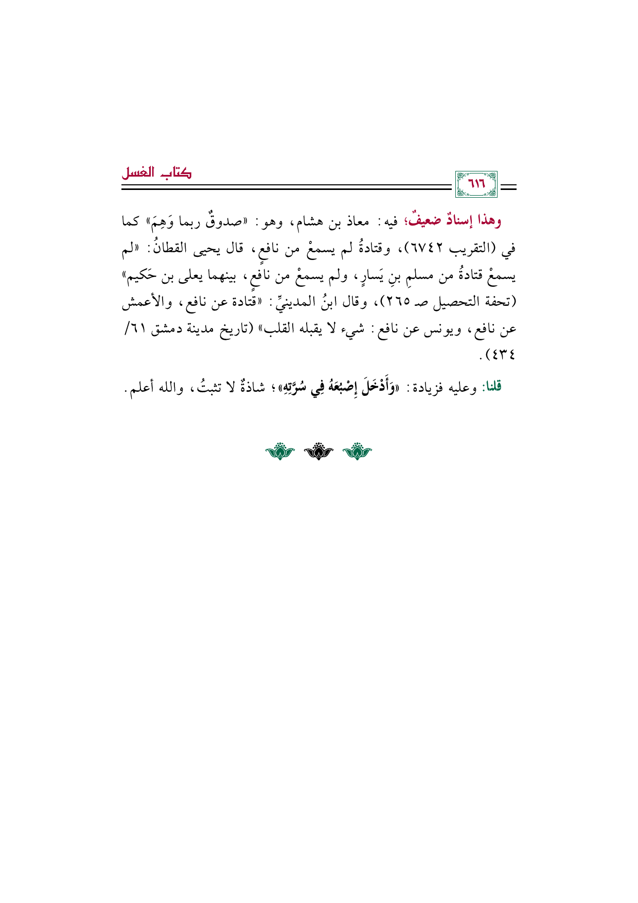 وهذا إسنادٌ ضعيفٌ؛ فيه: معاذ بن هشام، وهو: "صدوقٌ ربما وَهِمَ" كما في (التقريب ٦٧٤٢)، وقتادةُ لم يسمعْ من نافعٍ، قال يحيى القطانُ: "لم يسمعْ قتادةُ من مسلمِ بنِ يَسارٍ، ولم يسمعْ من نافعٍ، بينهما يعلى بن حَكيم" (تحفة التحصيل صـ ٢٦٥)، وقال ابنُ المدينيِّ: "قتادة عن نافع، والأعمش عن نافع، ويونس عن نافع: شيء لا يقبله القلب" (تاريخ مدينة دمشق ٦١/ ٤٣٤).