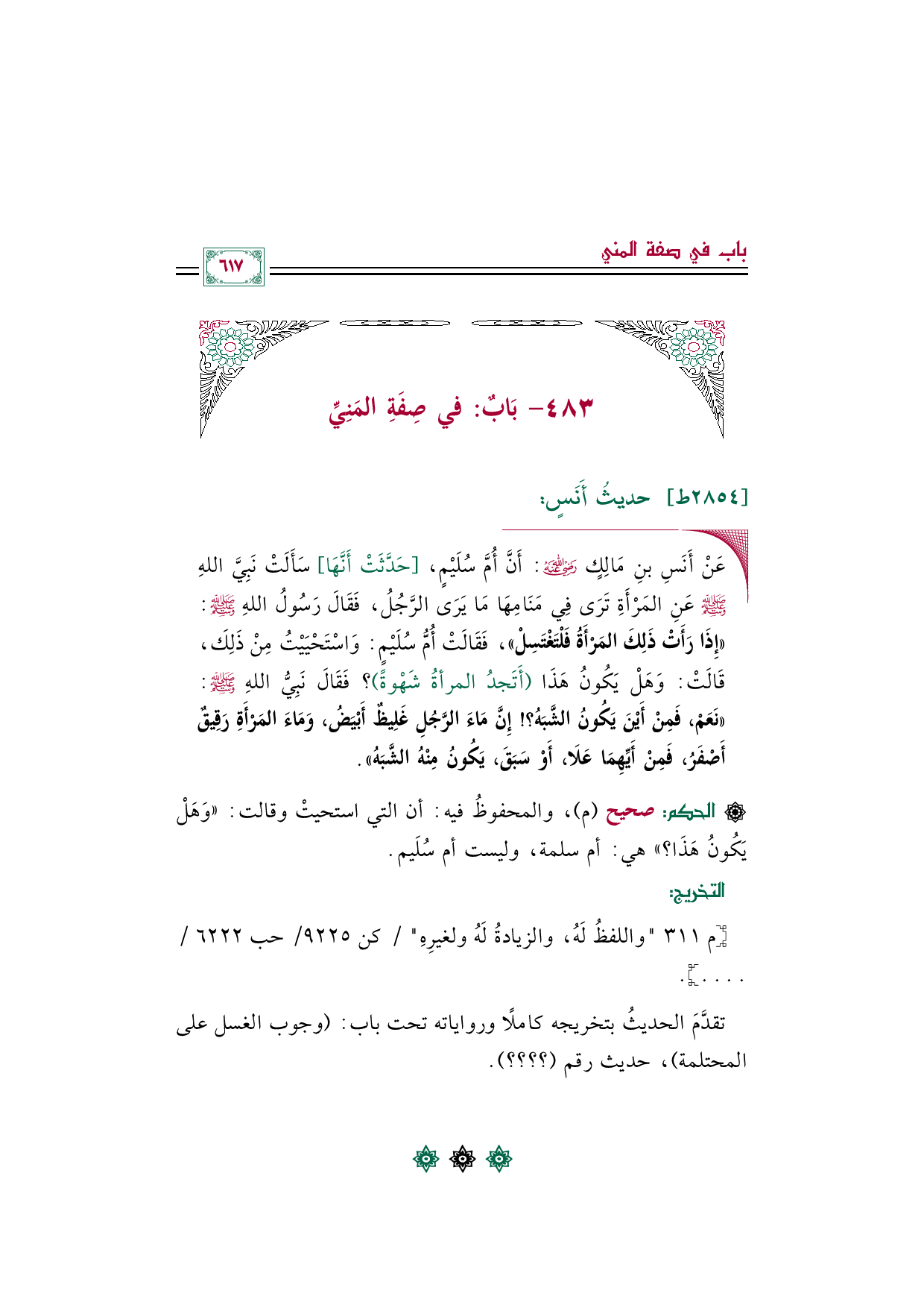 [الحكم]: صحيح (م)، والمحفوظُ فيه: أن التي استحيتْ وقالت: ((وَهَلْ يَكُونُ هَذَا؟ )) هي: أم سلمة، وليست أم سُلَيم.