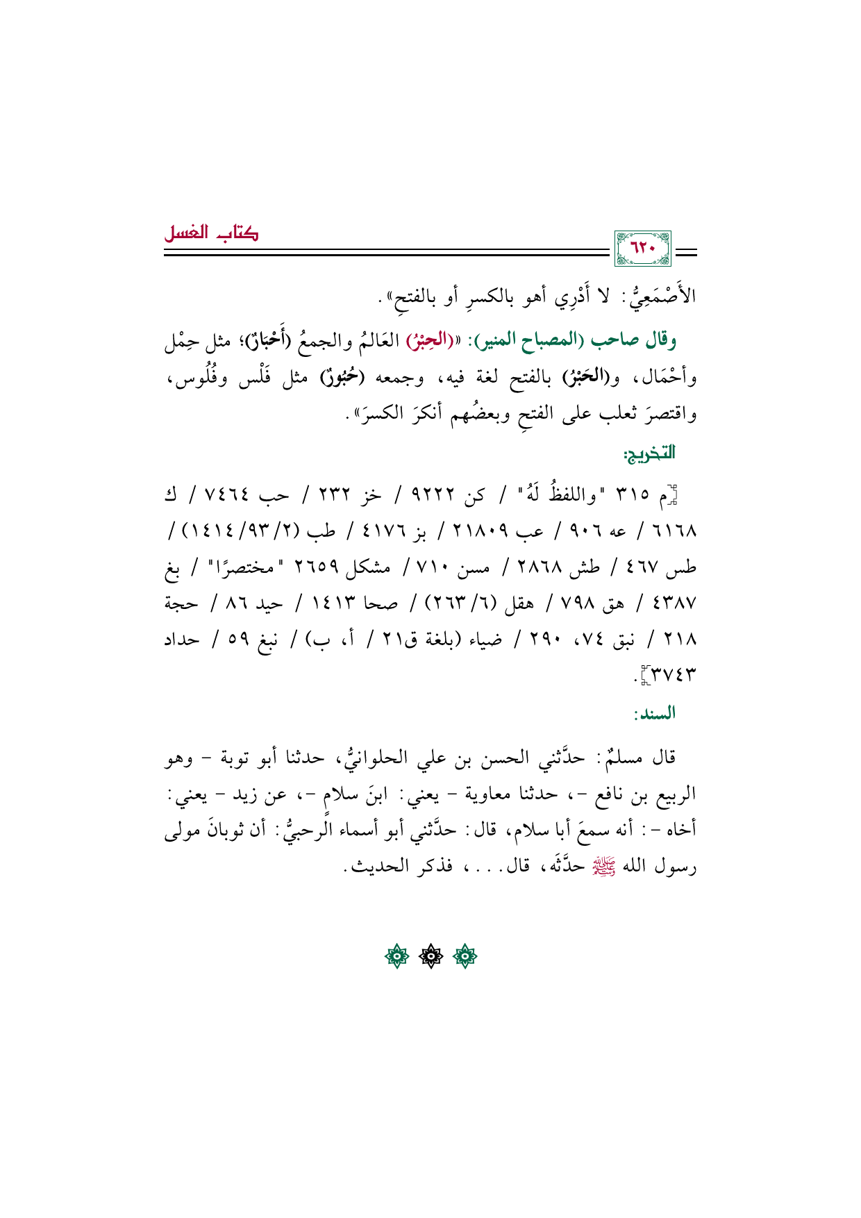 وقال صاحب (المصباح المنير): " (الحِبْرُ) العَالمُ والجمعُ (أَحْبَارٌ)؛ مثل حِمْل وأحْمَال، و (الحَبْرُ) بالفتح لغة فيه، وجمعه (حُبُورٌ) مثل فَلْس وفُلُوس، واقتصرَ ثعلب على الفتحِ وبعضُهم أنكرَ الكسرَ".