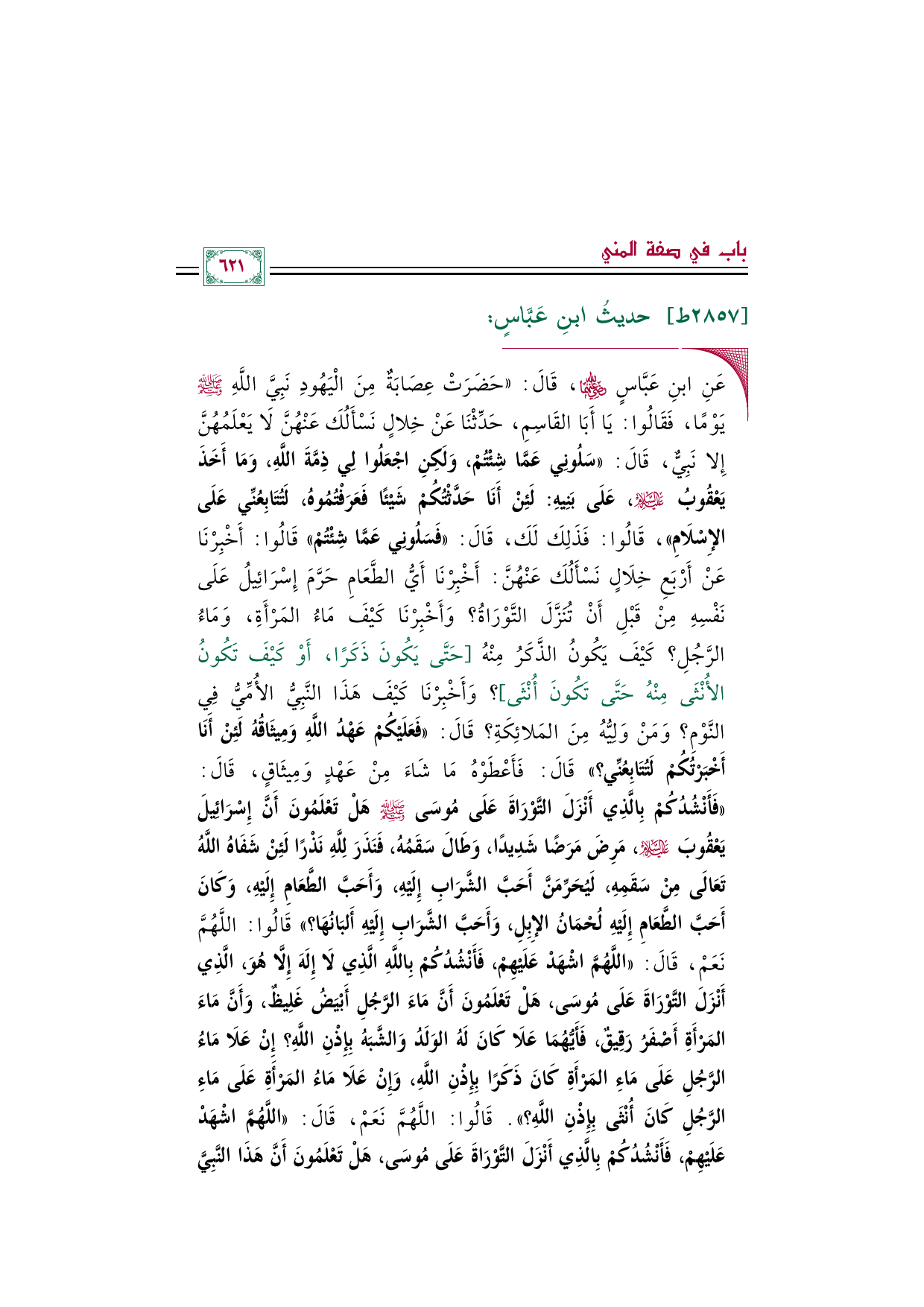 ◼ عَنِ ابنِ عَبَّاسٍ رضي الله عنهما، قَالَ: ((حَضَرَتْ عِصَابَةٌ مِنَ الْيَهُودِ نَبِيَّ اللَّهِ صلى الله عليه وسلم يَوْمًا، فَقَالُوا: يَا أَبَا القَاسِمِ، حَدِّثْنَا عَنْ خِلالٍ نَسْأَلُكَ عَنْهُنَّ لَا يَعْلَمُهُنَّ إِلا نَبِيٌّ، قَالَ: ((سَلُونِي عَمَّا شِئْتُمْ، وَلَكِنِ اجْعَلُوا لِي ذِمَّةَ اللَّهِ، وَمَا أَخَذَ يَعْقُوبُ عَلَيْهِ السَّلامُ، عَلَى بَنِيهِ: لَئِنْ أَنَا حَدَّثْتُكُمْ شَيْئًا فَعَرَفْتُمُوهُ، لَتُتَابِعُنِّي عَلَى الإِسْلَامِ))، قَالُوا: فَذَلِكَ لَكَ، قَالَ: ((فَسَلُونِي عَمَّا شِئْتُمْ)) قَالُوا: أَخْبِرْنَا عَنْ أَرْبَعِ خِلَالٍ نَسْأَلُكَ عَنْهُنَّ: أَخْبِرْنَا أَيُّ الطَّعَامِ حَرَّمَ إِسْرَائِيلُ عَلَى نَفْسِهِ مِنْ قَبْلِ أَنْ تُنَزَّلَ التَّوْرَاةُ؟ وَأَخْبِرْنَا كَيْفَ مَاءُ المَرْأَةِ، وَمَاءُ الرَّجُلِ؟ كَيْفَ يَكُونُ الذَّكَرُ مِنْهُ [حَتَّى يَكُونَ ذَكَرًا، أَوْ كَيْفَ تَكُونُ الأُنْثَى مِنْهُ حَتَّى تَكُونَ أُنْثَى]؟ وَأَخْبِرْنَا كَيْفَ هَذَا النَّبِيُّ الأُمِّيُّ فِي النَّوْمِ؟ وَمَنْ وَلِيُّهُ مِنَ المَلائِكَةِ؟ قَالَ: ((فَعَلَيْكُمْ عَهْدُ اللَّهِ وَمِيثَاقُهُ لَئِنْ أَنَا أَخْبَرْتُكُمْ لَتُتَابِعُنِّي؟ )) قَالَ: فَأَعْطَوْهُ مَا شَاءَ مِنْ عَهْدٍ وَمِيثَاقٍ، قَالَ: ((فَأَنْشُدُكُمْ بِالَّذِي أَنْزَلَ التَّوْرَاةَ عَلَى مُوسَى صلى الله عليه وسلم هَلْ تَعْلَمُونَ أَنَّ إِسْرَائِيلَ يَعْقُوبَ عَلَيْهِ السَّلامُ، مَرِضَ مَرَضًا شَدِيدًا، وَطَالَ سَقَمُهُ، فَنَذَرَ لِلَّهِ نَذْرًا لَئِنْ شَفَاهُ اللَّهُ تَعَالَى مِنْ سَقَمِهِ، لَيُحَرِّمَنَّ أَحَبَّ الشَّرَابِ إِلَيْهِ، وَأَحَبَّ الطَّعَامِ إِلَيْهِ، وَكَانَ أَحَبَّ الطَّعَامِ إِلَيْهِ لُحْمَانُ الإِبِلِ، وَأَحَبَّ الشَّرَابِ إِلَيْهِ أَلبَانُهَا؟ )) قَالُوا: اللَّهُمَّ نَعَمْ، قَالَ: