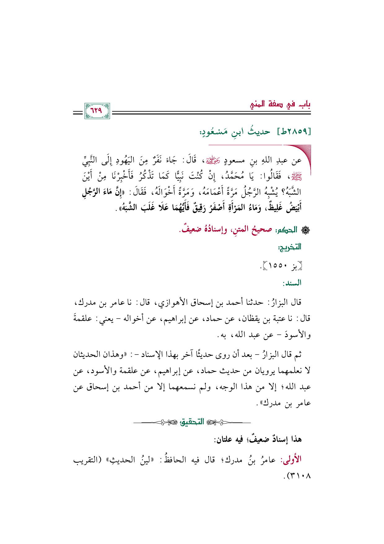ثم قال البزارُ -بعد أن روى حديثًا آخر بهذا الإسناد-: "وهذان الحديثان لا نعلمهما يرويان من حديث حماد، عن إبراهيم، عن علقمة والأسود، عن عبد الله؛ إلا من هذا الوجه، ولم نسمعهما إلا من أحمد بن إسحاق عن عامر بن مدرك".