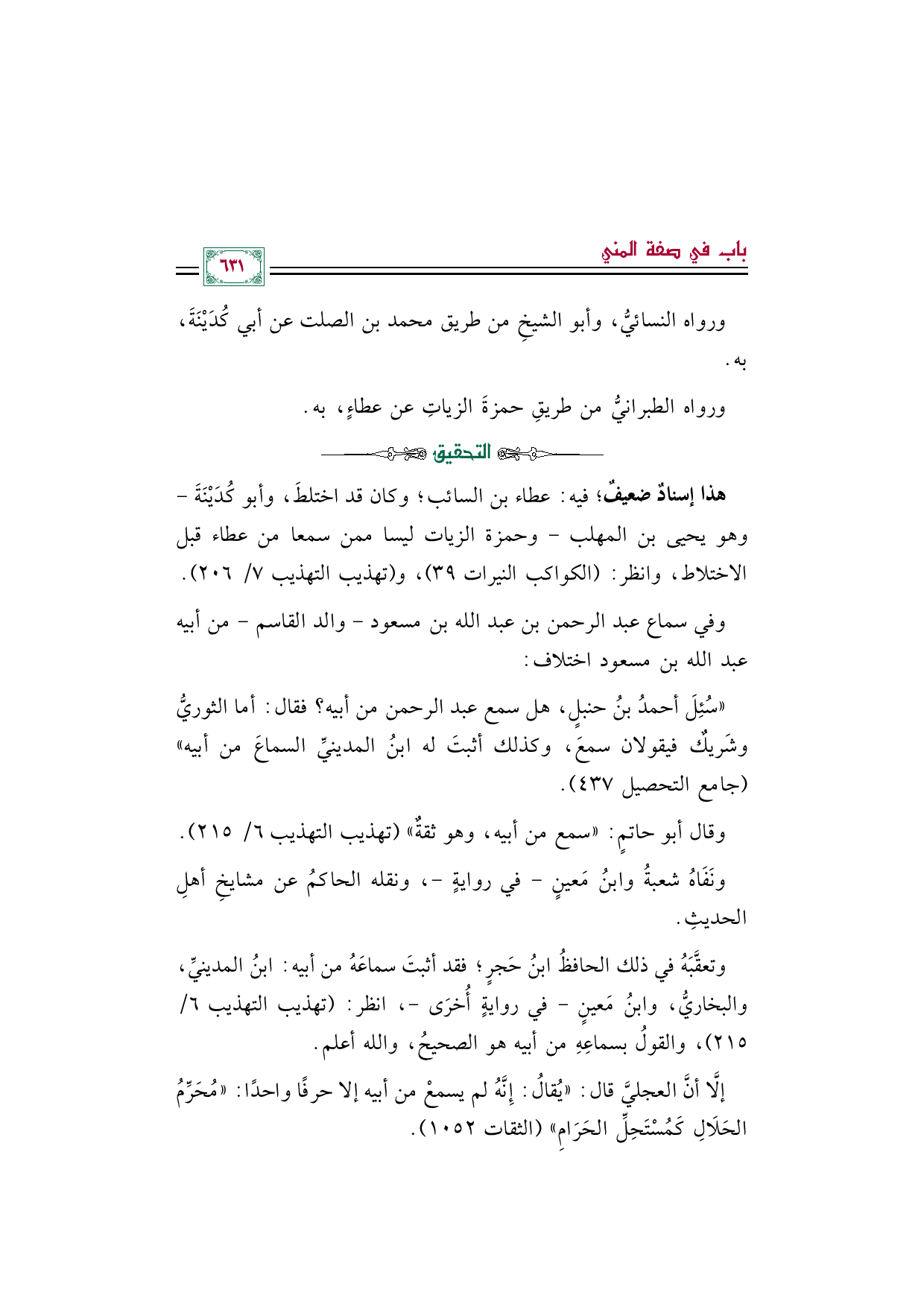 "سُئِلَ أحمدُ بنُ حنبلٍ، هل سمع عبد الرحمن من أبيه؟ فقال: أما الثوريُّ وشَريكٌ فيقولان سمعَ، وكذلك أثبتَ له ابنُ المدينيِّ السماعَ من أبيه" (جامع التحصيل ٤٣٧).