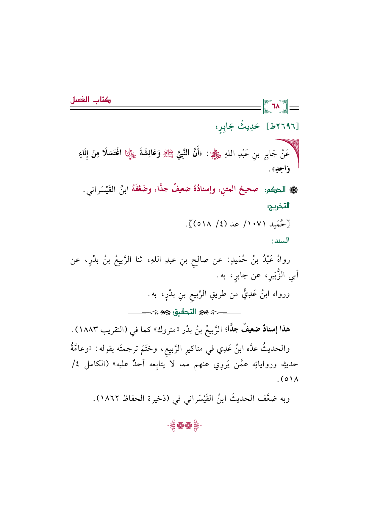 ◼ عَنْ جَابِرِ بنِ عَبْدِ اللهِ رضي الله عنهما: ((أَنَّ النَّبِيَّ صلى الله عليه وسلم وَعَائِشَةَ رضي الله عنها اغْتَسَلَا مِنْ إِنَاءٍ وَاحِدٍ)).