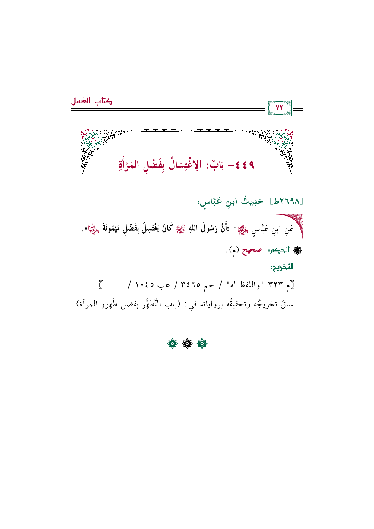 ◼ عَنِ ابنِ عَبَّاسٍ رضي الله عنهما: ((أَنَّ رَسُولَ اللهِ صلى الله عليه وسلم كَانَ يَغْتَسِلُ بِفَضْلِ مَيْمُونَةَ رضي الله عنها)).