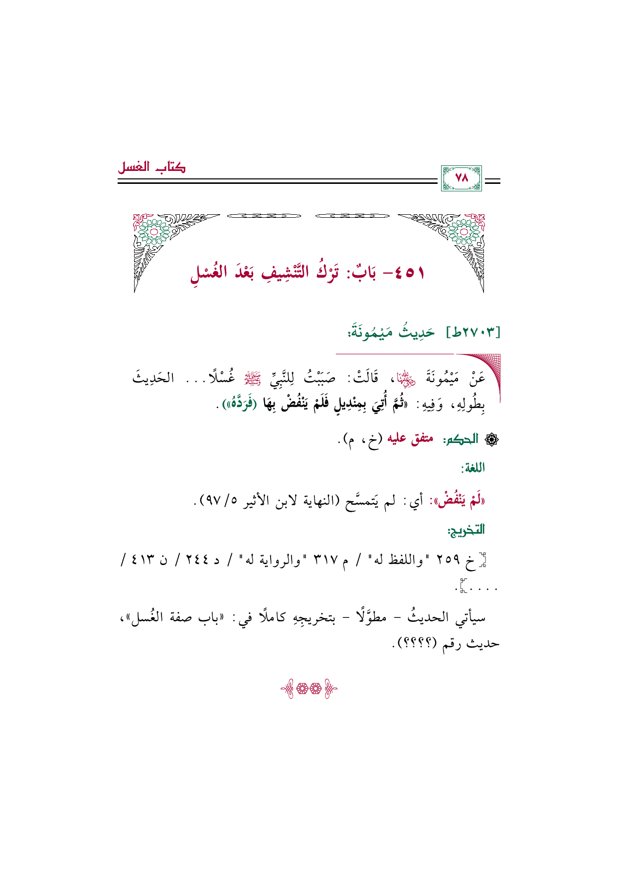 ◼ عَنْ مَيْمُونَةَ رضي الله عنها، قَالَتْ: صَبَبْتُ لِلنَّبِيِّ صلى الله عليه وسلم غُسْلًا ... الحَدِيثَ بِطُولِهِ، وَفِيهِ: ((ثُمَّ أُتِيَ بِمِنْدِيلٍ فَلَمْ يَنْفُضْ بِهَا (فَرَدَّهُ))).