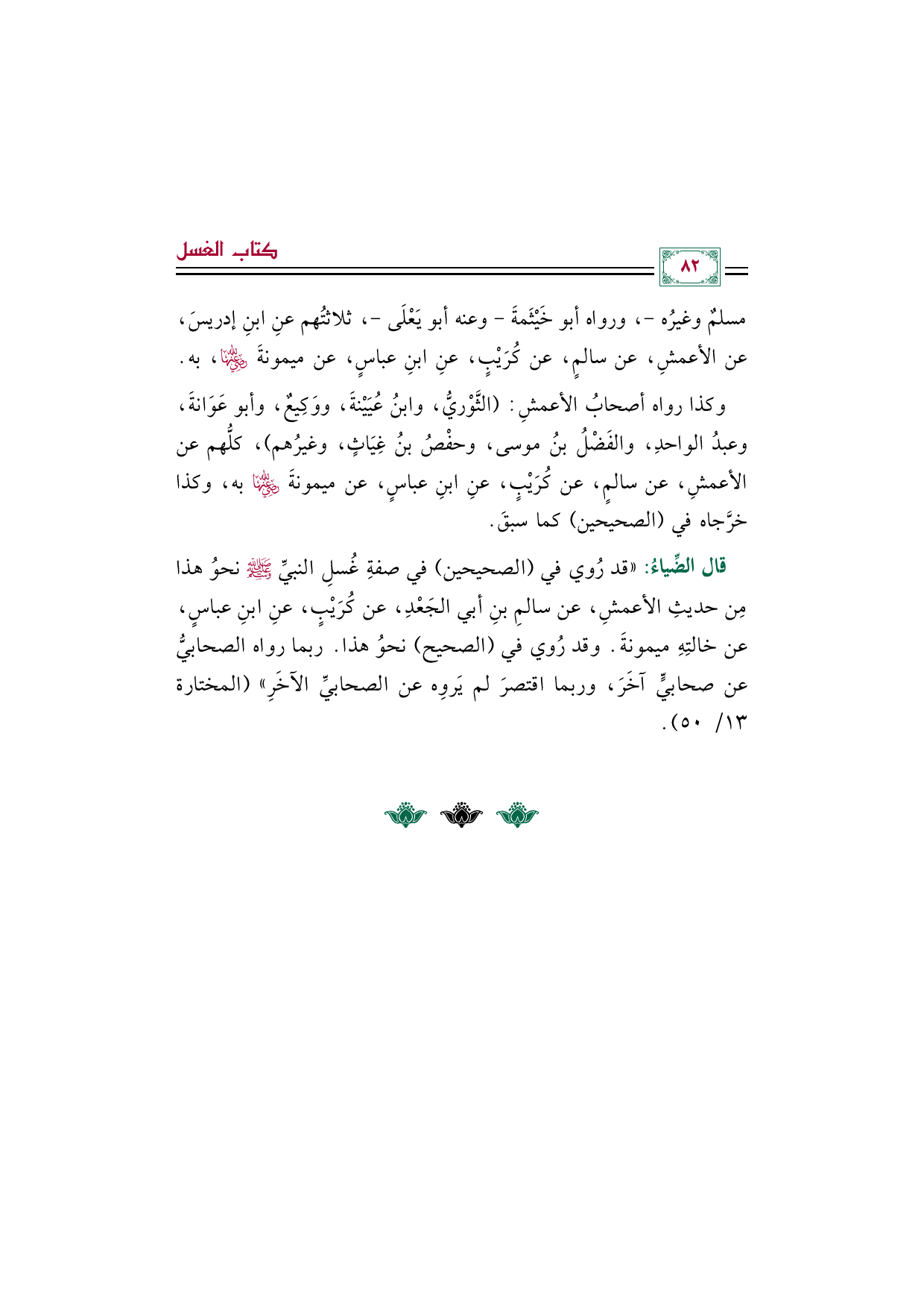 مسلمٌ وغيرُه-، ورواه أبو خَيْثَمةَ -وعنه أبو يَعْلَى-، ثلاثتُهم عنِ ابنِ إدريسَ، عن الأعمشِ، عن سالمٍ، عن كُرَيْبٍ، عنِ ابنِ عباسٍ، عن ميمونةَ رضي الله عنها، به.